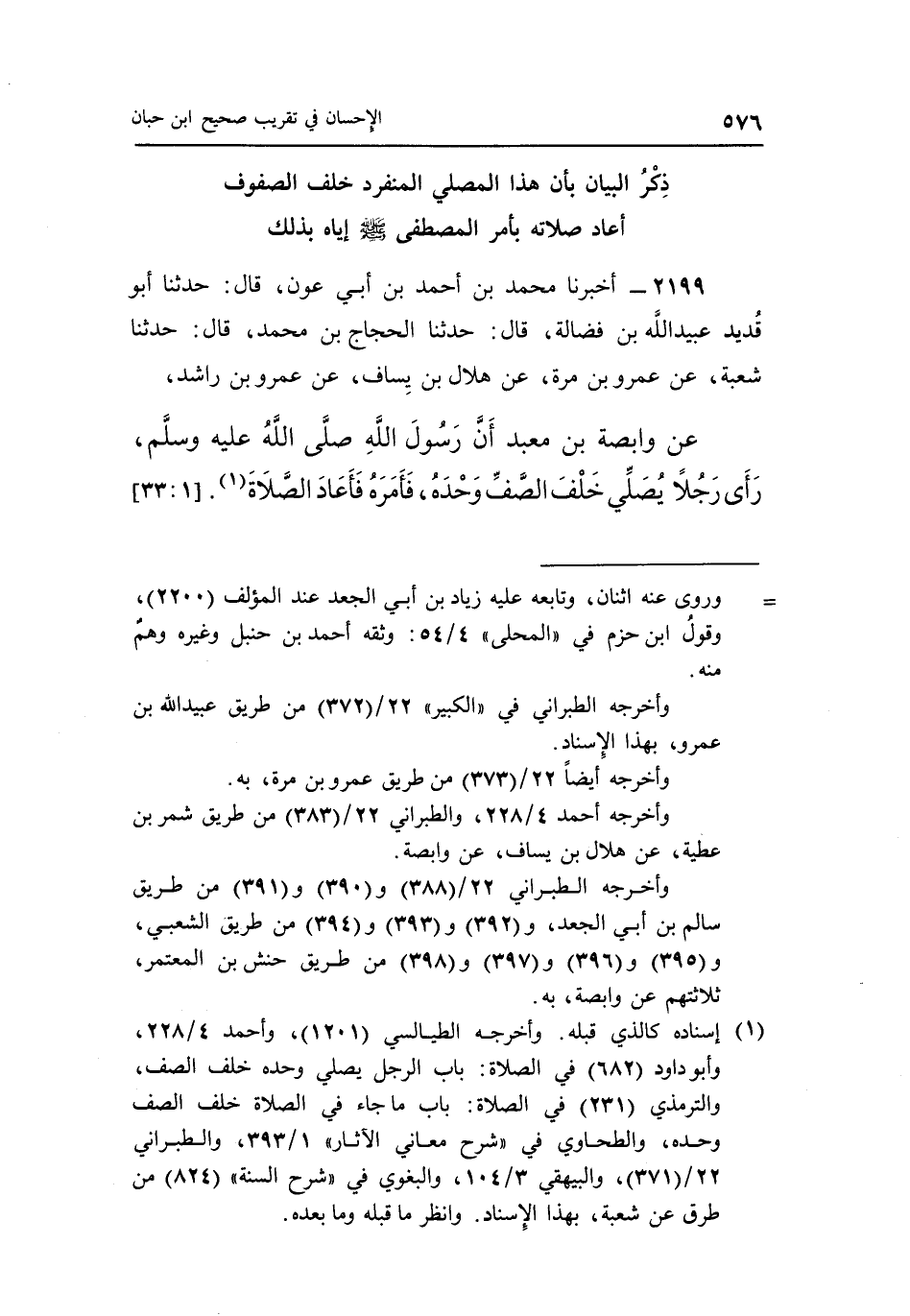 عَنْ وَابِصَةَ بْنِ مَعْبَدٍ أَنَّ رَسُولَ اللَّهِ صَلَّى اللَّهُ عَلَيْهِ وَسَلَّمَ، رَأَى رَجُلًا يُصَلِّي خَلْفَ الصَّفِّ وَحْدَهُ، فأمره فأعاد الصلاة1. [1: 33]