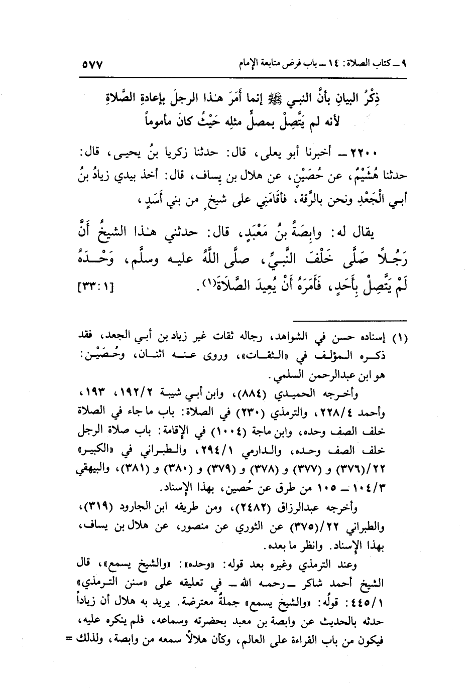 يُقَالُ لَهُ: وَابِصَةُ بْنُ مَعْبَدٍ، قَالَ: حَدَّثَنِي هَذَا الشَّيْخُ أَنَّ رَجُلًا صَلَّى خَلْفَ النَّبِيِّ صَلَّى اللَّهُ عَلَيْهِ وَسَلَّمَ، وَحْدَهُ لَمْ يَتَّصِلْ بِأَحَدٍ، فَأَمَرَهُ أن يعيد الصلاة1. [1: 33]