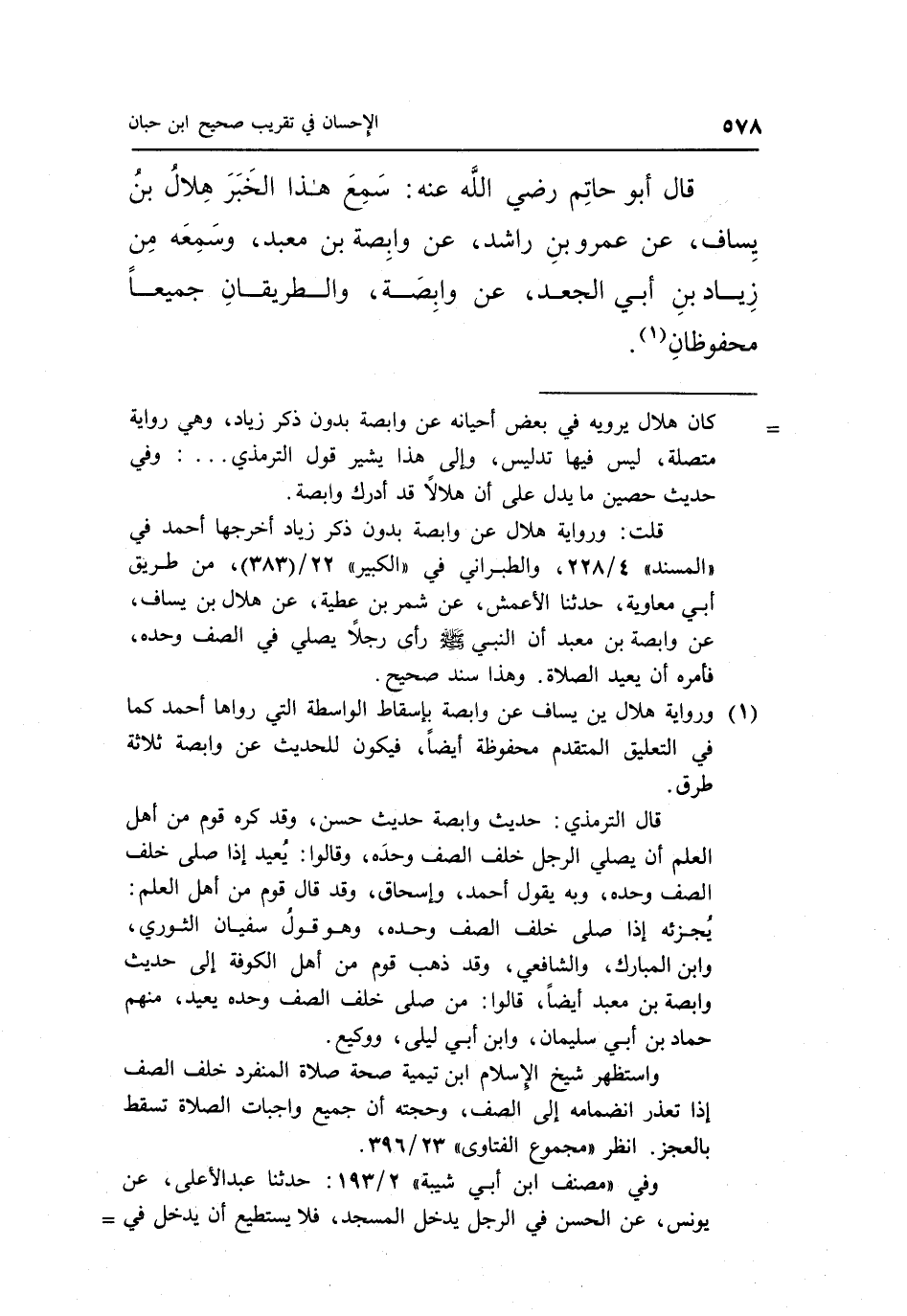 قلت: ورواية هلال عن وابصة بدون ذكر زياد أخرجها أحمد في "المسند" 4/228، والطبراني في "الكبير" 22/ "383"، من طريق أبي معاوية، حدثنا الأعمش عن شمر بن عطية، عن هلال بن يساف، عن وابصة بن معبد قال: أن النبي صلى الله عليه وسلم رأى رجلا يصلي في الصف وحده، فأمره أن يعيد الصلاة. وهذا سند صحيح.