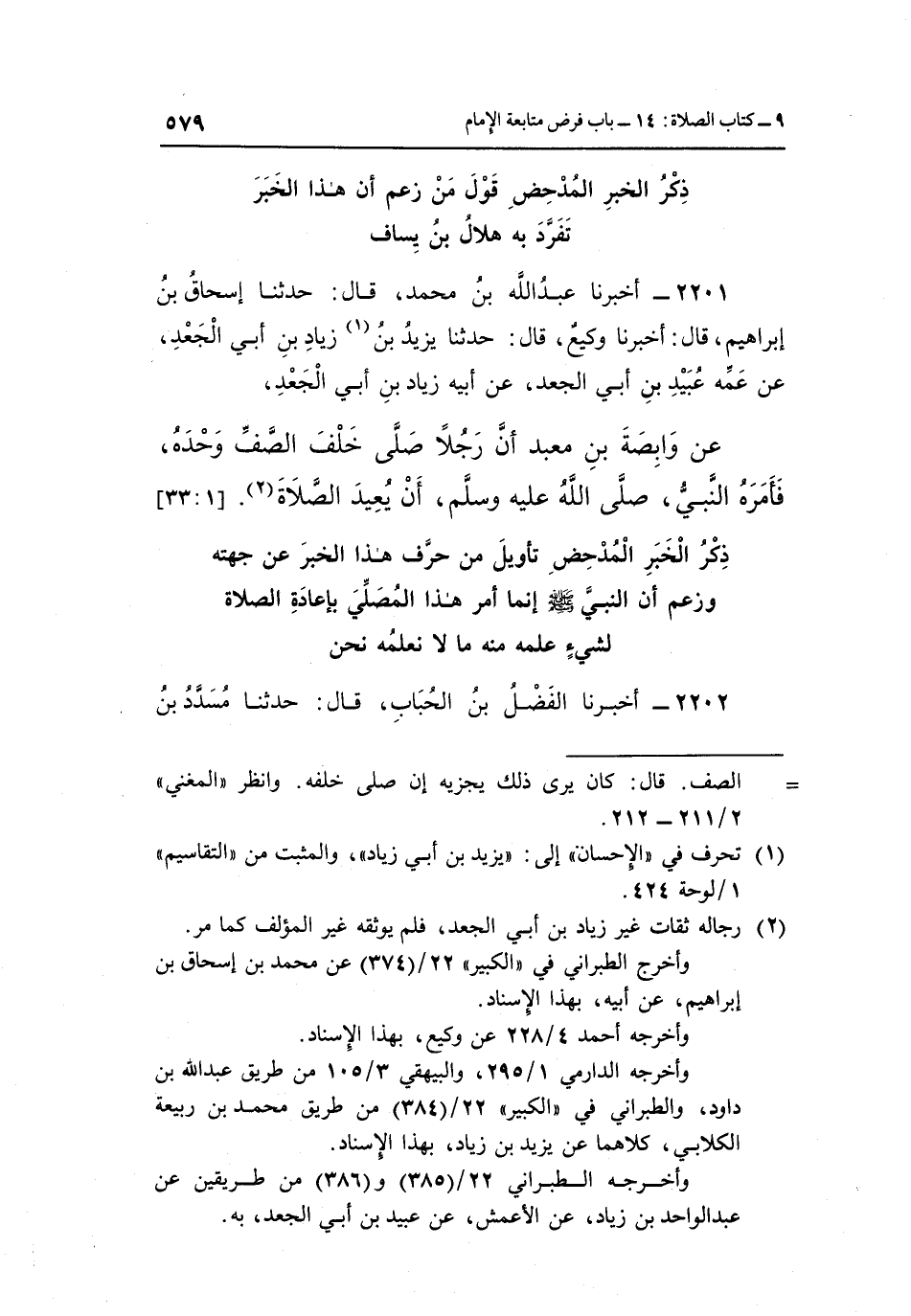 عَنْ وَابِصَةَ بْنِ مَعْبَدٍ أَنَّ رَجُلًا صَلَّى خَلْفَ الصَّفِّ وَحْدَهُ، فَأَمَرَهُ النَّبِيُّ صَلَّى اللَّهُ عَلَيْهِ وَسَلَّمَ، أَنْ يعيد الصلاة2. [1: 33]