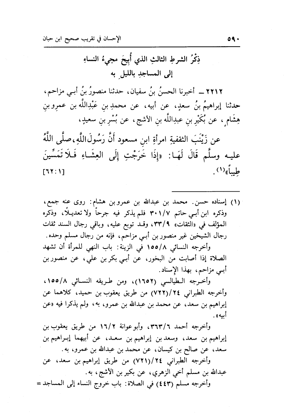 عَنْ زَيْنَبَ الثَّقَفِيَّةِ امرأة بْنِ مَسْعُودٍ أَنَّ رَسُولَ اللَّهِ صَلَّى اللَّهُ عَلَيْهِ وَسَلَّمَ، قَالَ لَهَا: "إِذَا خَرَجْتِ إِلَى الْعِشَاءِ فلا تمسين طيبا" 1. [1: 62]