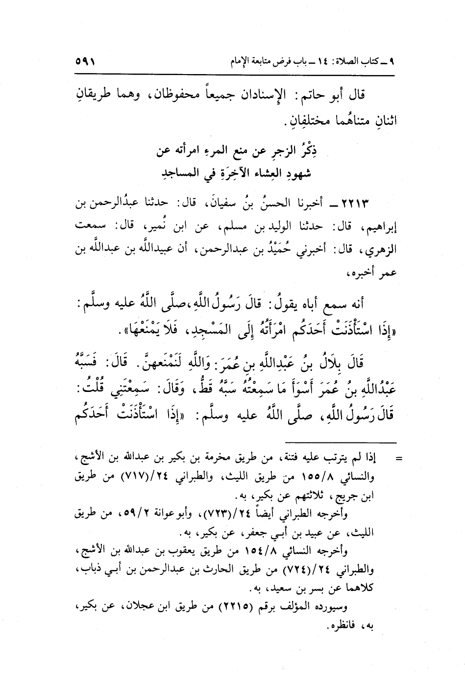 قَالَ بِلَالُ بْنُ عَبْدِ اللَّهِ بْنِ عُمَرَ: وَاللَّهِ لَنَمْنَعُهُنَّ. قَالَ: فَسَبَّهُ عَبْدُ اللَّهِ بْنُ عُمَرَ أَسْوَأَ مَا سَمِعْتُهُ سَبَّهُ قَطُّ، وَقَالَ: سَمِعْتَنِي قُلْتُ: قَالَ رَسُولُ اللَّهِ صَلَّى اللَّهُ عَلَيْهِ وَسَلَّمَ: "إذا استأذنت أحدكم