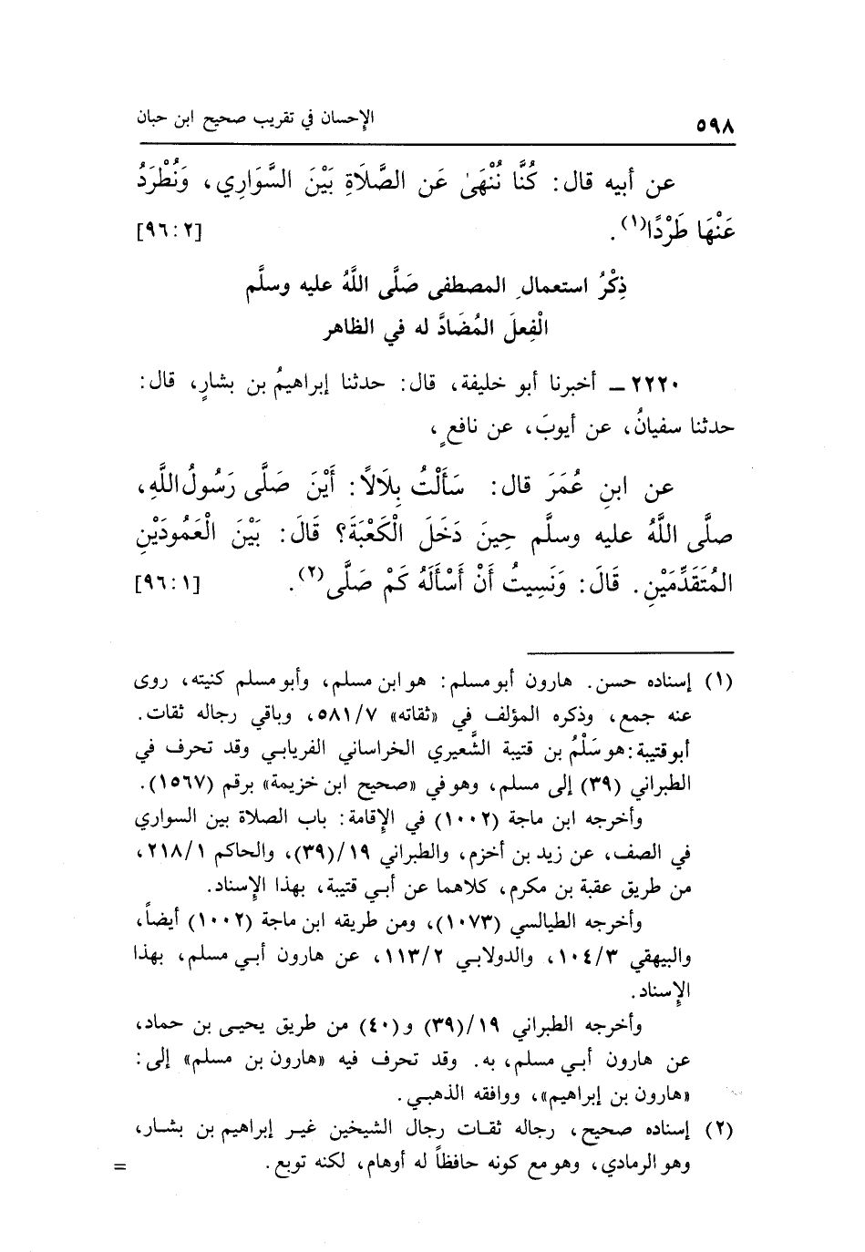 عَنِ ابْنِ عُمَرَ قَالَ: سَأَلْتُ بِلَالًا: أَيْنَ صَلَّى رَسُولُ اللَّهِ صَلَّى اللَّهُ عَلَيْهِ وَسَلَّمَ، حِينَ دَخَلَ الْكَعْبَةَ؟ قَالَ: بَيْنَ الْعَمُودَيْنِ الْمُتَقَدِّمَيْنَ. قَالَ: ونسيت أن أسأله كم صلى2. [1: 96]