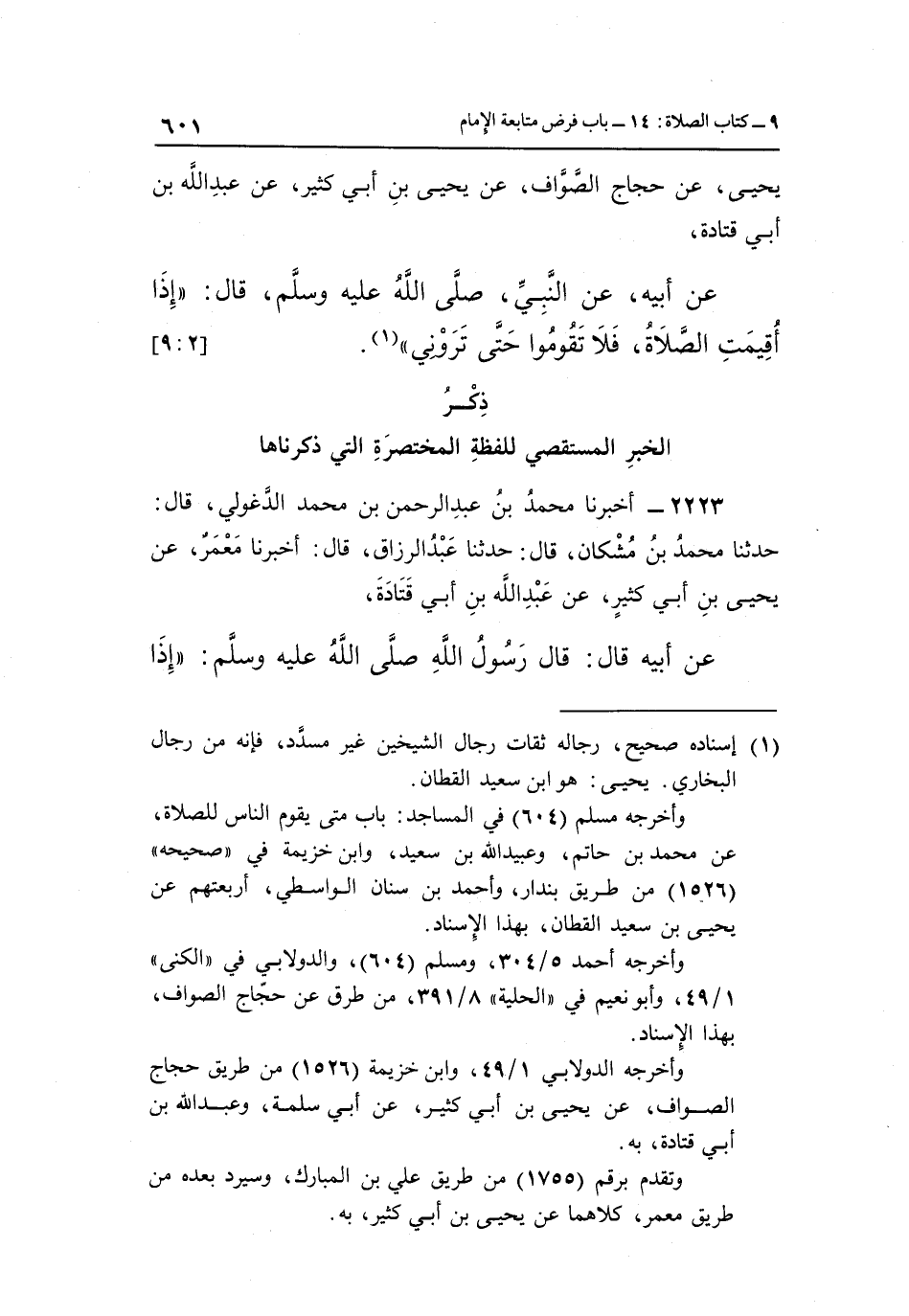 2223 - أَخْبَرَنَا مُحَمَّدُ بْنُ عَبْدِ الرَّحْمَنِ بْنِ مُحَمَّدٍ الدَّغُولِيُّ، قَالَ: حَدَّثَنَا مُحَمَّدُ بْنُ مُشْكَانَ، قَالَ: حَدَّثَنَا عَبْدُ الرَّزَّاقِ، قَالَ: أَخْبَرَنَا مَعْمَرٌ، عَنْ يَحْيَى بْنِ أَبِي كَثِيرٍ، عَنْ عَبْدِ اللَّهِ بْنِ أَبِي قَتَادَةَ،