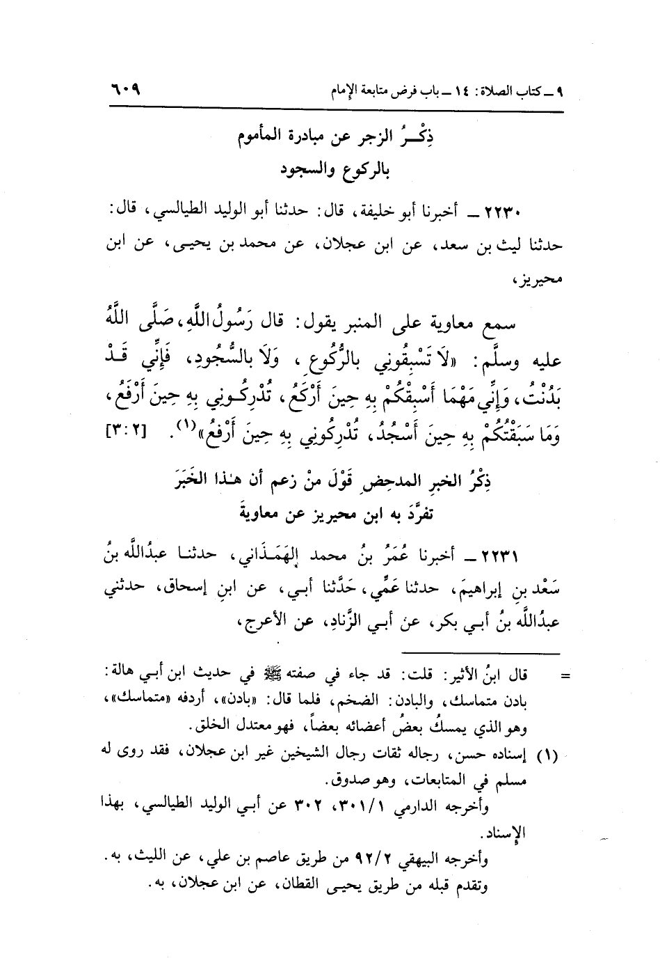 سَمِعَ مُعَاوِيَةَ عَلَى الْمِنْبَرِ يَقُولُ: قَالَ رَسُولُ اللَّهِ صَلَّى اللَّهُ عَلَيْهِ وَسَلَّمَ: "لَا تَسْبِقُونِي بِالرُّكُوعِ، وَلَا بِالسُّجُودِ، فَإِنِّي قَدْ بَدَّنْتُ، وَإِنِّي مَهْمَا أَسْبِقْكُمْ بِهِ حِينَ أَرْكَعُ، تُدْرِكُونِي بِهِ حِينَ أَرْفَعُ، وَمَا سَبَقْتُكُمْ بِهِ حين أسجد، تدركوني به حين أرفع" 1. [2: 3]