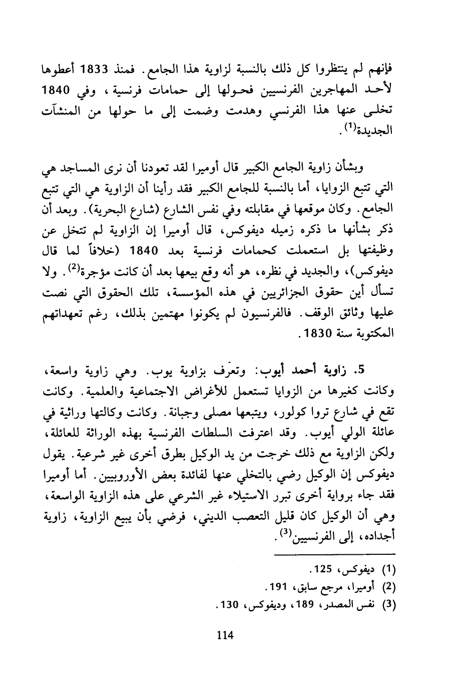 وبشأن زاوية الجامع الكبير قال أوميرا لقد تعودنا أن نرى المساجد هي التي تتبع الزوايا، أما بالنسبة للجامع الكبير فقد رأينا أن الزاوية هي التي تتبع الجامع. وكان موقعها في مقابلته وفي نفس الشارع (شارع البحرية). وبعد أن ذكر بشأنها ما ذكره زميله ديفوكس، قال أوميرا إن الزاوية لم تتخل عن وظيفتها بل استعملت كحمامات فرنسية بعد 1840 (خلافا لما قال ديفوكس)، والجديد في نظره، هو أنه وقع بيعها بعد أن كانت مؤجرة (¬2). ولا تسأل أين حقوق الجزائريين في هذه المؤسسة، تلك الحقوق التي نصت عليها وثائق الوقف. فالفرنسيون لم يكونوا مهتمين بذلك، رغم تعهداتهم المكتوبة سنة 1830.