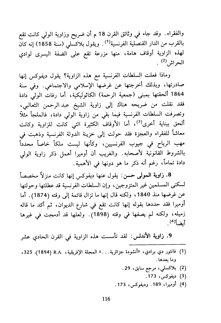والفقراء. وقد جاء في وثائق القرن 18 م أن ضريح وزاوية الولي كانت تقع بالقرب من الدار القنصلية الفرنسية (¬1). ويقول بلاكسلي (سنة 1858) إنه كان لهذه الزاوية أوقاف هامة، منها مزرعة تقع على الضفة اليسرى لوادي الحراش (¬2).