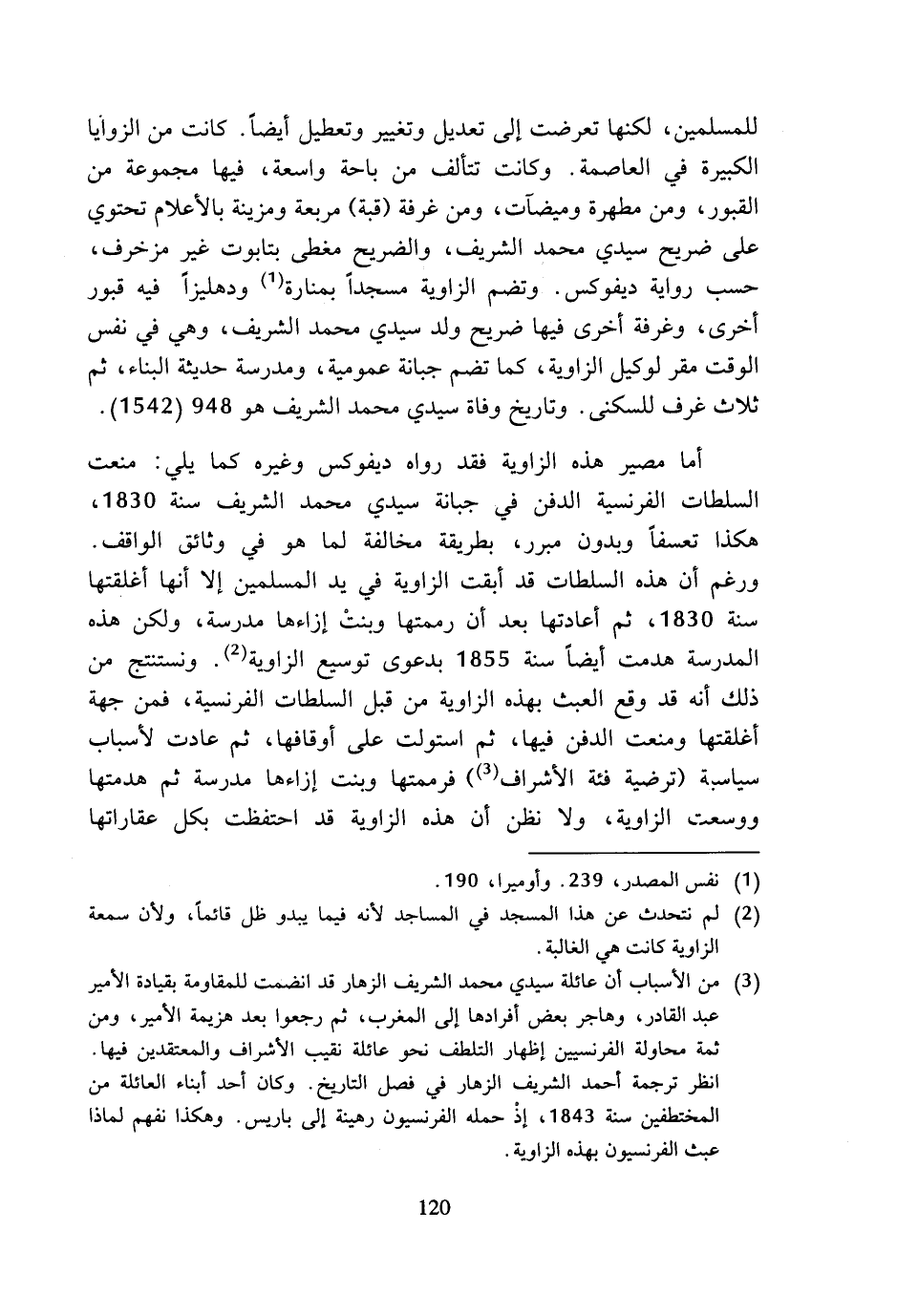 (¬3) من الأسباب أن عائلة سيدي محمد الشريف الزهار قد انضمت للمقاومة بقيادة الأمير عبد القادر، وهاجر بعض أفرادها إلى المغرب، ثم رجعوا بعد هزيمة الأمير، ومن ثمة محاولة الفرنسيين إظهار التلطف نحو عائلة نقيب الأشراف والمعتقدين فيها. انظر ترجمة أحمد الشريف الزهار في فصل التاريخ. وكان أحد أبناء العائلة من المختطفين سنة 1843، إذ حمله الفرنسيون رهينة إلى باريس. وهكذا نفهم لماذا عبث الفرنسيون بهذه الزاوية.