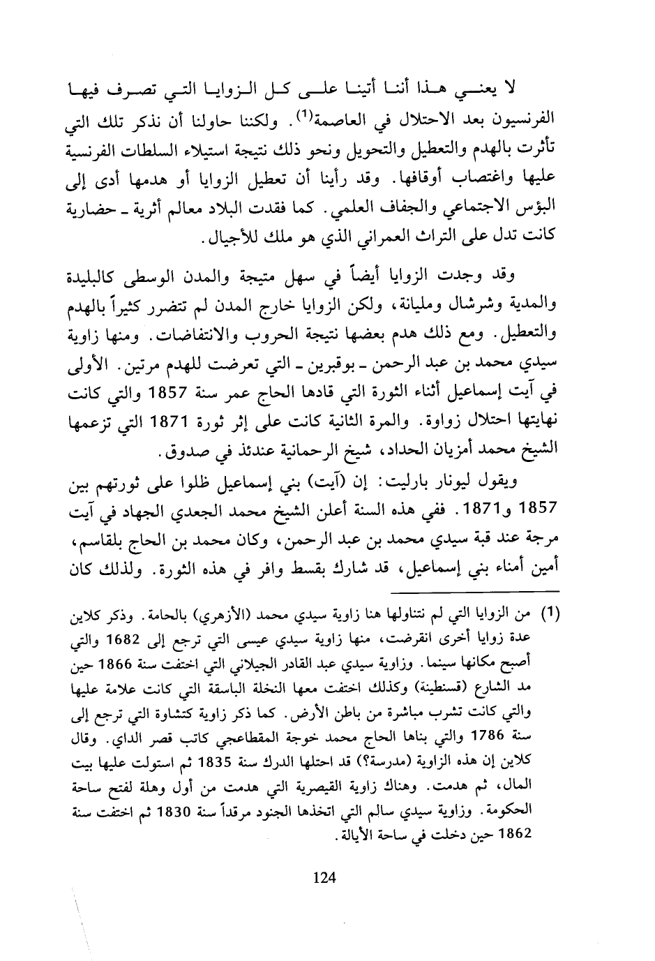 لا يعني هذا أننا أتينا على كل الزوايا التي تصرف فيها الفرنسيون بعد الاحتلال في العاصمة (¬1). ولكننا حاولنا أن نذكر تلك التي تأثرت بالهدم والتعطيل والتحويل ونحو ذلك نتيجة استيلاء السلطات الفرنسية عليها واغتصاب أوقافها. وقد رأينا أن تعطيل الزوايا أو هدمها أدى إلى البؤس الاجتماعي والجفاف العلمي. كما فقدت البلاد معالم أثرية - حضارية كانت تدل على التراث العمراني الذي هو ملك للأجيال.