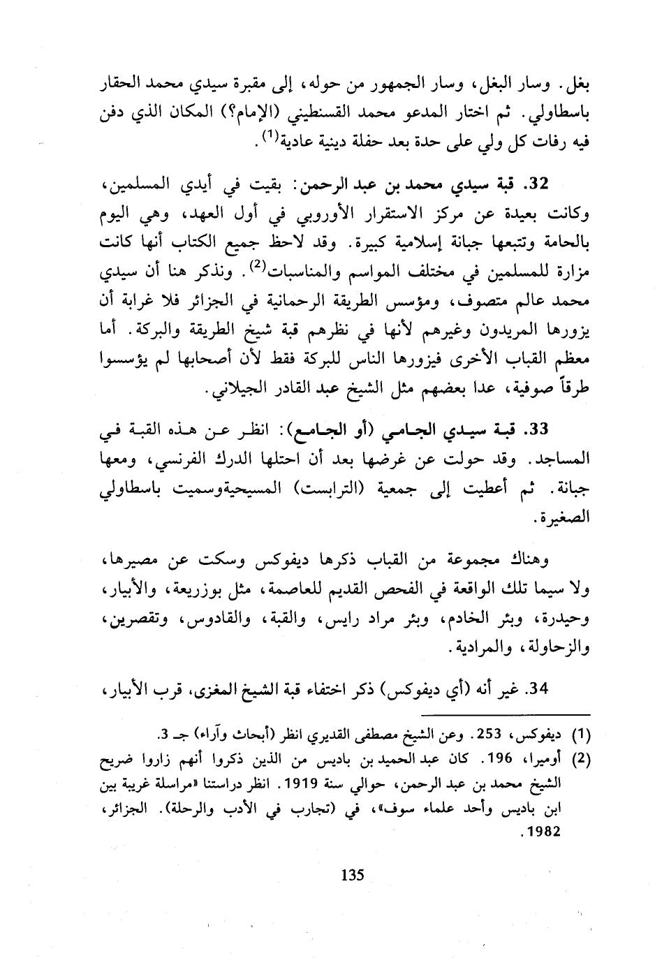 (¬2) أوميرا، 196. كان عبد الحميد بن باديس من الذين ذكروا أنهم زاروا ضريح الشيخ محمد بن عبد الرحمن، حوالي سنة 1919. انظر دراستنا (مراسلة غريبة بين ابن باديس وأحد علماء سوف)، في (تجارب في الأدب والرحلة). الجزائر، 1982.