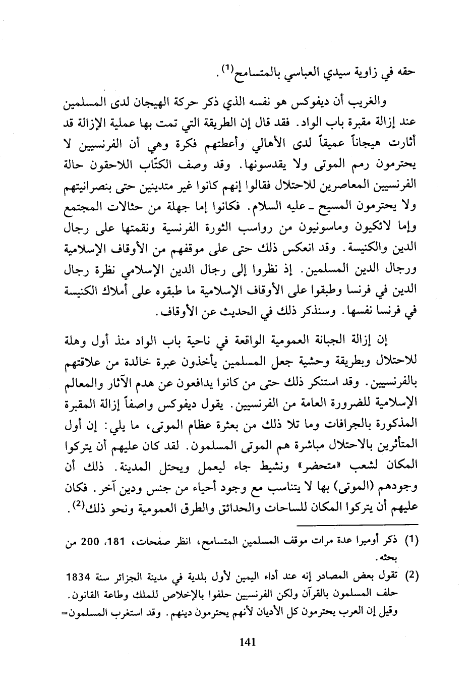 والغريب أن ديفوكس هو نفسه الذي ذكر حركة الهيجان لدى المسلمين عند إزالة مقبرة باب الواد. فقد قال إن الطريقة التي تمت بها عملية الإزالة قد أثارت هيجانا عميقا لدى الأهالي وأعطتهم فكرة وهي أن الفرنسيين لا يحترمون رمم الموتى ولا يقدسونها. وقد وصف الكتاب اللاحقون حالة الفرنسيين المعاصرين للاحتلال فقالوا إنهم كانوا غير متدينين حتى بنصرانيتهم ولا يحترمون المسيح - عليه السلام. فكانوا إما جهلة من حثالات المجتمع وإما لائكيون وماسونيون من رواسب الثورة الفرنسية ونقمتها على رجال الدين والكنيسة. وقد انعكس ذلك حتى على موقفهم من الأوقاف الإسلامية ورجال الدين المسلمين. إذ نظروا إلى رجال الدين الإسلامي نظرة رجال الدين في فرنسا وطبقوا على الأوقاف الإسلامية ما طبقوه على أملاك الكنيسة في فرنسا نفسها. وسنذكر ذلك في الحديث عن الأوقاف.