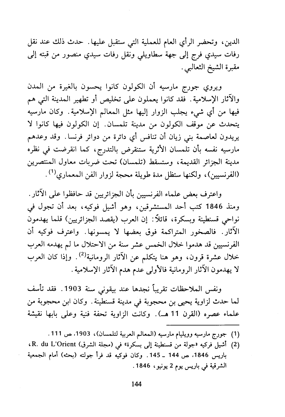 واعترف بعض علماء الفرنسيين بأن الجزائريين قد حافظوا على الآثار. ومنذ 1846 كتب أحد المستشرقين، وهو أشيل فوكيه، بعد أن تجول في نواحي قسنطينة وبسكرة، قائلا: إن العرب (يقصد الجزائريين) قلما يهدمون الآثار. فالصخور المتراكمة فوق بعضها لا يمسونها. واعترف فوكيه أن الفرنسيين قد هدموا خلال الخمس عشر سنة من الاحتلال ما لم يهدمه العرب خلال عشرة قرون، وهو هنا يكلم عن الآثار الرومانية (¬2). وإذا كان العرب لا يهدمون الآثار الرومانية فالأولى عدم هدم الآثار الإسلامية.