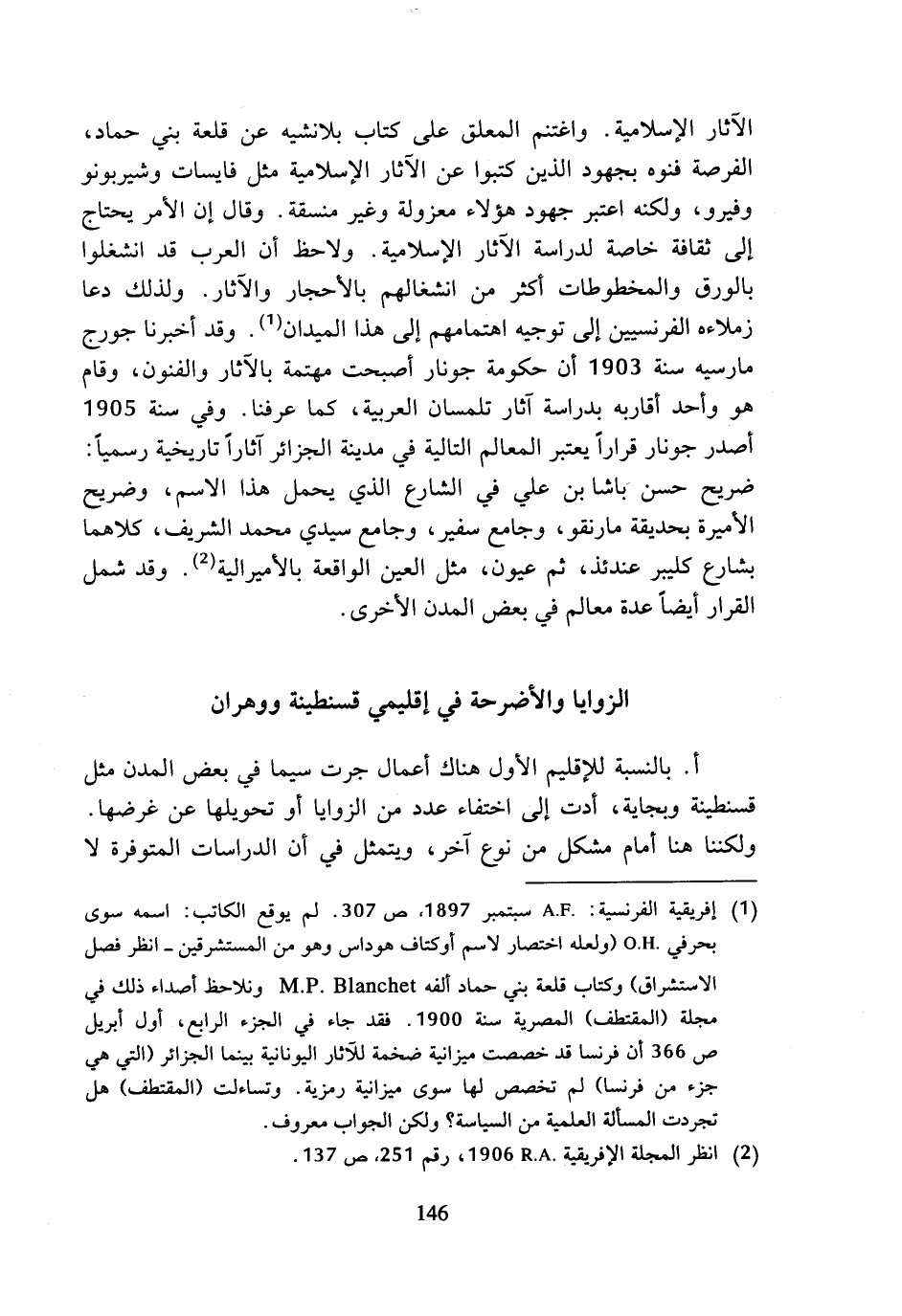 الآثار الإسلامية. واغتنم المعلق على كتاب بلانشيه عن قلعة يي حماد، الفرصة فنوه بجهود الذين كتبوا عن الآثار الإسلامية مثل فايسات وشيربونو وفيرو، ولكنه اعتبر جهود هؤلاء معزولة وغير منسقة. وقال إن الأمر يحتاج إلى ثقافة خاصة لدراسة الآثار الإسلامية. ولاحظ أن العرب قد انشغلوا بالورق والمخطوطات أكثر من انشغالهم بالأحجار والآثار. ولذلك دعا زملاءه الفرنسيين إلى توجيه اهتمامهم إلى هذا الميدان (¬1). وقد أخبرنا جورج مارسيه سنة 1903 أن حكومة جونار أصبحت مهتمة بالآثار والفنون، وقام هو وأحد أقاربه بدراسة آثار تلمسان العربية، كما عرفنا. وفي سنة 1905 أصدر جونار قرارا يعتبر المعالم التالية في مدينة الجزائر آثارا تاريخية رسميا: ضريح حسن باشا بن علي في الشارع الذي يحمل هذا الاسم، وضريح الأميرة بحديقة مارنقو، وجامع سفير، وجامع سيدي محمد الشريف، كلاهما بشارع كليبر عندئذ، ثم عيون، مثل العين الواقعة بالأميرالية (¬2). وقد شمل القرار أيضا عدة معالم في بعض المدن الأخرى.