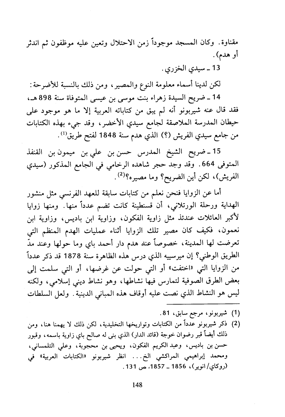 (¬2) ذكر شيربونو عددا من الكتابات وتواريخها التخليدية، لكن ذلك لا يهمنا هنا، ومن ذلك أيضا قبر رضوان خوجة (قائد الدار) الذي بنى له صالح باي زاوية باسمه، وقبور حسن بن باديس، وعبد الكريم الفكون، ويحيى بن محجوبة، وعلي التلمساني، ومحمد إبراهيمي المراكشي الخ ... انظر شيربونو (الكتابات العربية) في (روكاي/ انوير)، 1856 - 1857، ص 131.