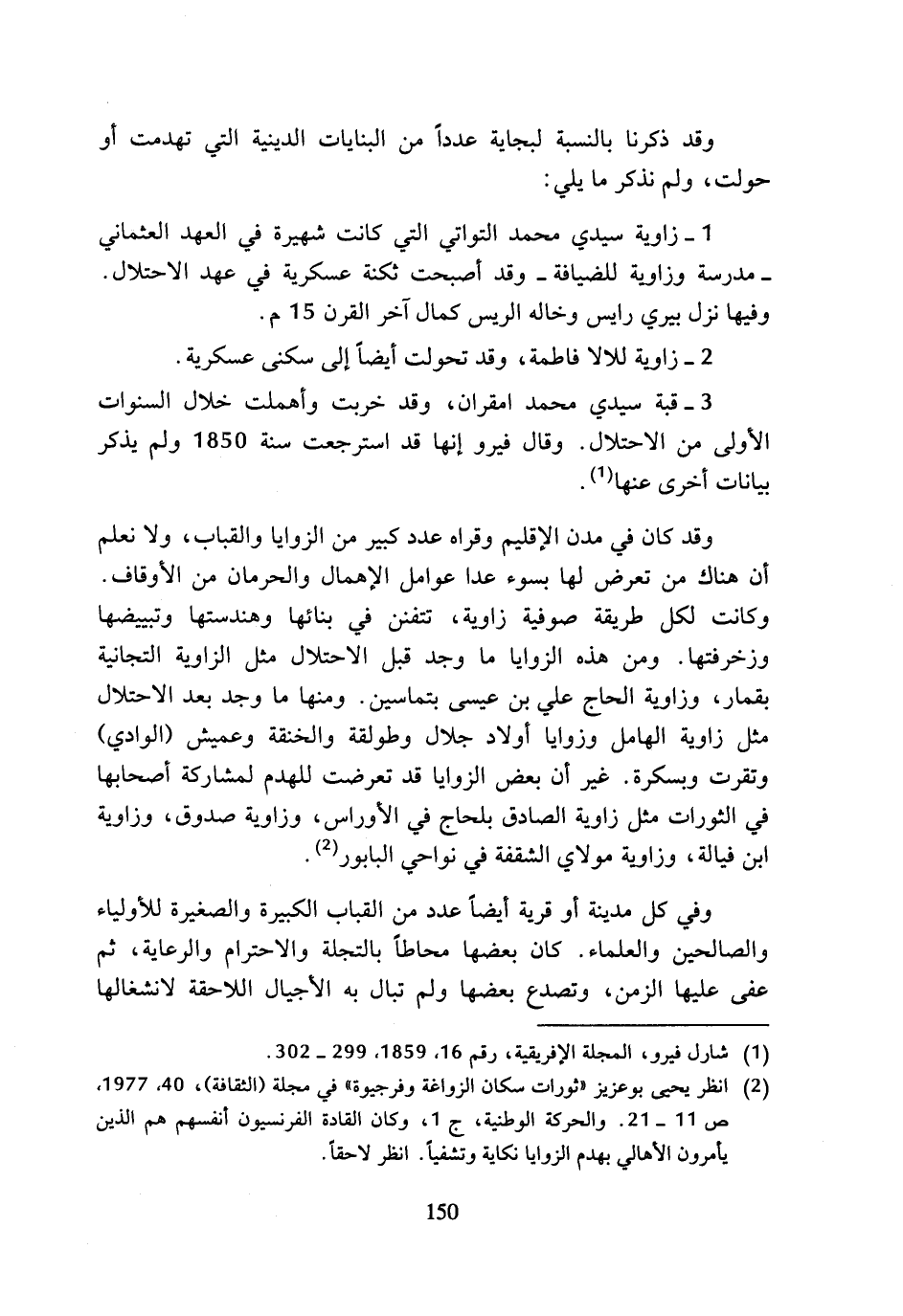(¬2) انظر يحيى بوعزيز (ثورات سكان الزواغة وفرجيوة) في مجلة (الثقافة)، 40، 1977، ص 11 - 21. والحركة الوطنية، ج 1، وكان القادة الفرنسيون أنفسهم هم الذين يأمرون الأهالي بهدم الزوايا نكاية وتشفيا. انظر لاحقا.