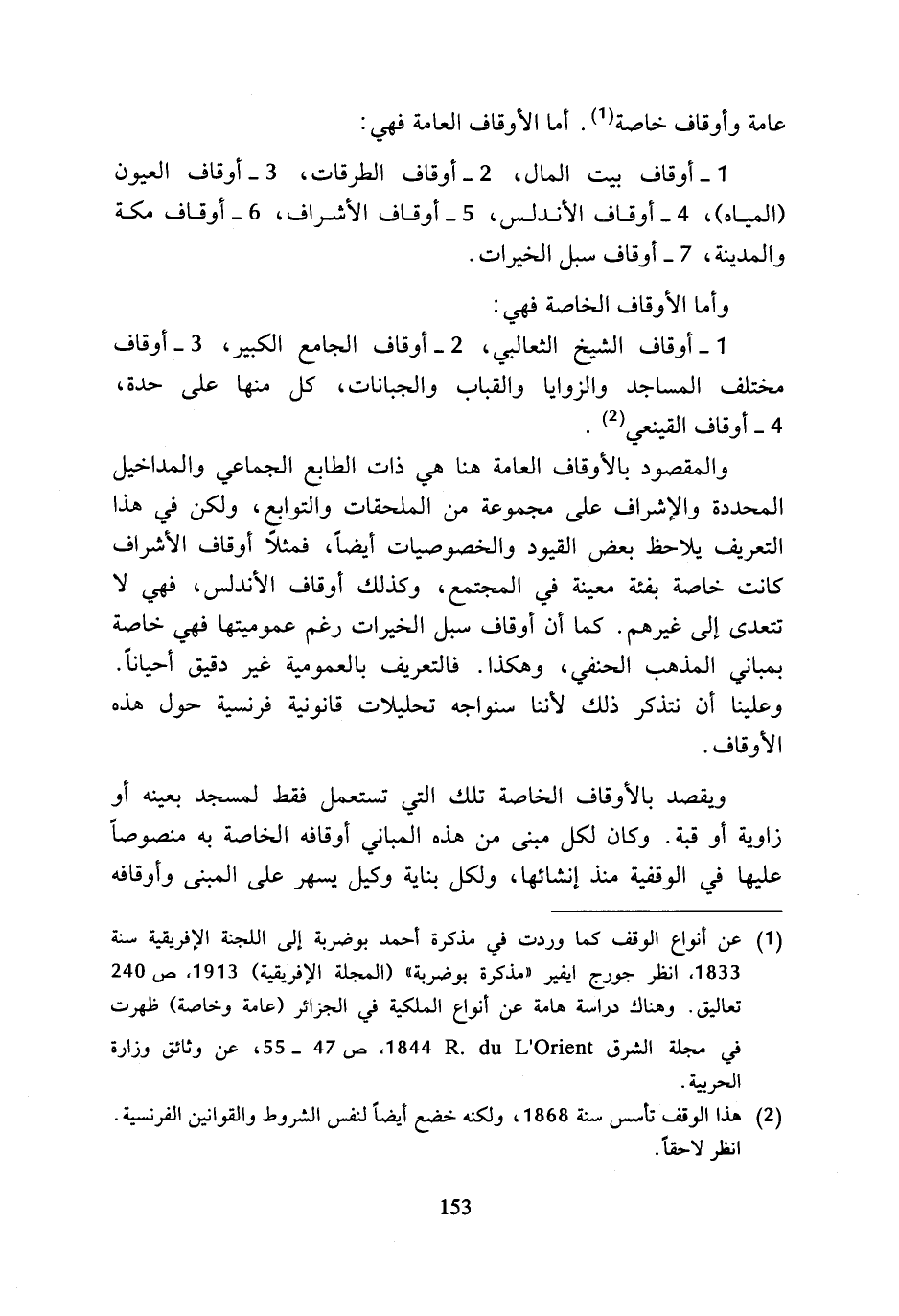 (¬1) عن أنواع الوقف كما وردت في مذكرة أحمد بوضربة إلى اللجنة الإفريقية سنة 1833، انظر جورج ايفير (مذكرة بوضربة) (المجلة الإفريقية) 1913، ص 240 تعاليق. وهناك دراسة هامة عن أنواع الملكية في الجزائر (عامة وخاصة) ظهرت في مجلة الشرق R. de L'Orient 1844، ص 47 - 55، عن وثائق وزارة الحربية.