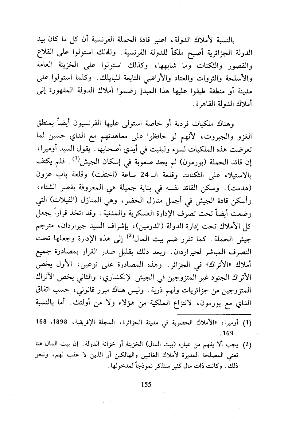 وهناك ملكيات فردية أو خاصة استولى عليها الفرنسيون أيضا بمنطق الغزو والجبروت، لأنهم لو حافظوا على معاهدتهم مع الداي حسين لما تعرضت هذه الملكيات لسوء ولبقيت في أيدي أصحابها. يقول السيد أوميرا، إن قائد الحملة (بورمون) لم يجد صعوبة في إسكان الجيش (¬1). فلم يكتف بالاستيلاء على الثكنات وقلعة ال 24 ساعة (اختفت) وقلعة باب عزون (هدمت). وسكن القائد نفسه في بناية جميلة هي المعروفة بقصر الشتاء، وأسكن قادة الجيش في أجمل منازل الحضر، وهي المنازل (الفيلات) التي وضعت أيضا تحت تصرف الإدارة العسكرية والمدنية. وقد اتخذ قرارا بجعل كل الأملاك تحت إدارة الدولة (الدومين)، بإشراف السيد جيراردان، مترجم جيش الحملة. كما تقرر ضم بيت المال (¬2) إلى هذه الإدارة وجعلها تحت التصرف المباشر لجيراردان. وبعد ذلك بقليل صدر القرار بمصادرة جميع أملاك (الأتراك) في الجزائر. وهذه المصادرة على نوعين، الأول يخص الأتراك الجنود غير المتزوجين في الجيش الإنكشاري، والثاني يخص الأتراك المتزوجين من جزائريات ولهم ذرية. وليس هناك مبرر قانوني، حسب اتفاق الداي مع بورمون، لانتزاع الملكية من هؤلاء ولا من أولئك. أما بالنسبة