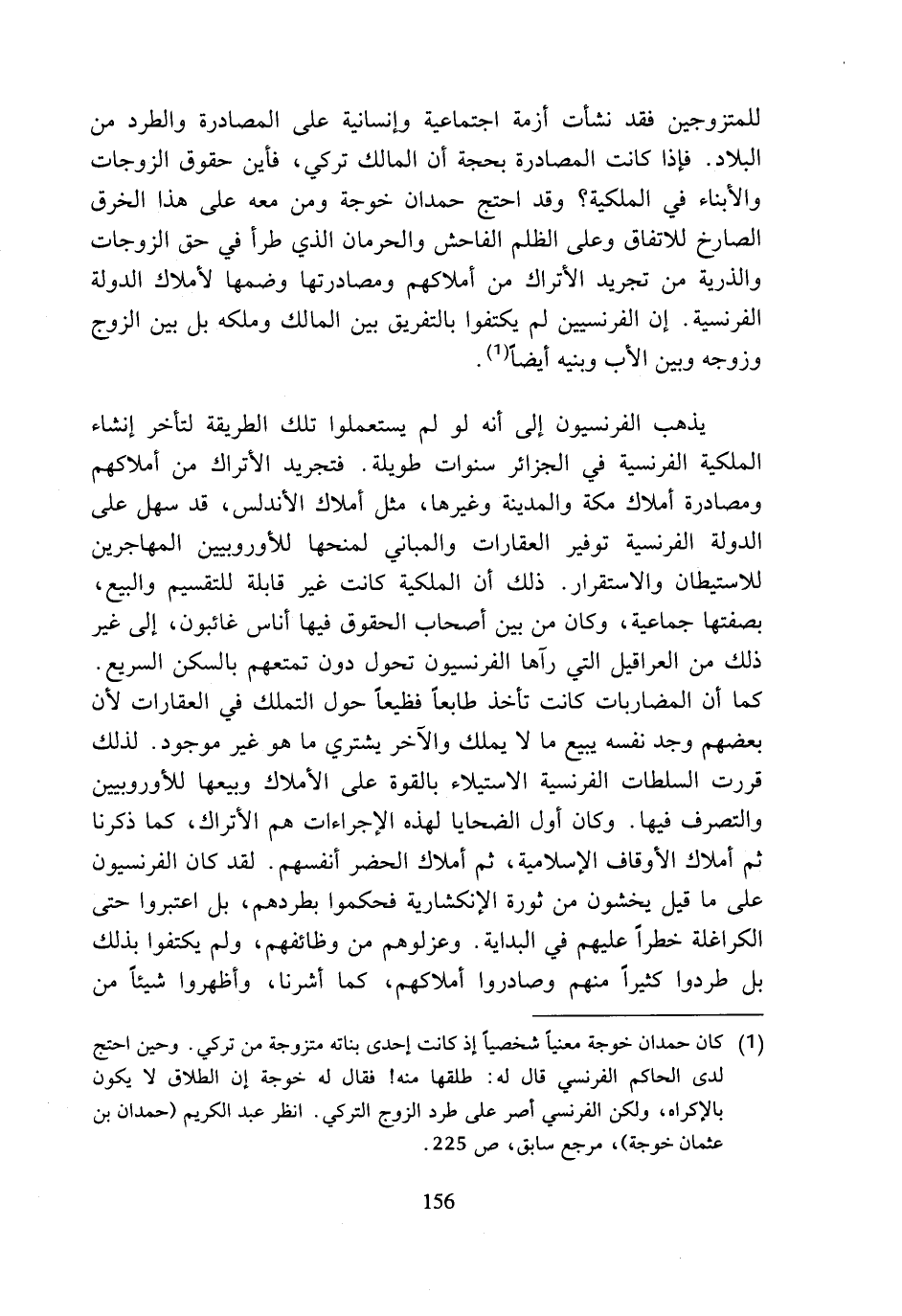 (¬1) كان حمدان خوجة معنيا شخصيا إذ كانت إحدى بناته متزوجة من تركي. وحين احتج لدى الحاكم الفرنسي قال له: طلقها منه! فقال له خوجة إن الطلاق لا يكون بالإكراه، ولكن الفرنسي أصر على طرد الزوج التركي. انظر عبد الكريم (حمدان بن عثمان خوجة)، مرجع سابق، ص 225.