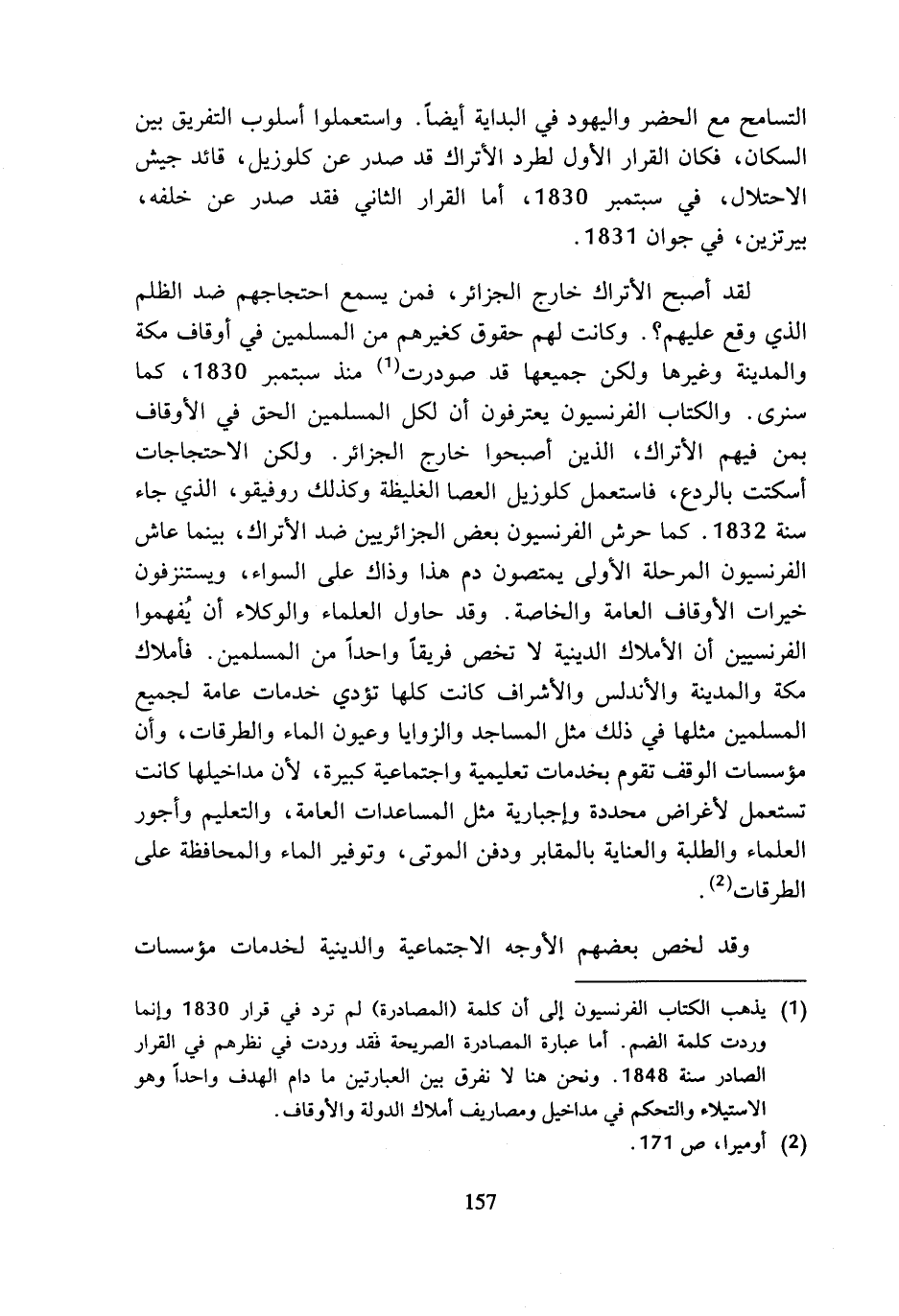 (¬1) يذهب الكتاب الفرنسيون إلى أن كلمة (المصادرة) لم ترد في قرار 1830 وإنما وردت كلمة الضم. أما عبارة المصادرة الصريحة نقد وردت في نظرهم في القرار الصادر سنة 1848. ونحن هنا لا نفرق بين العبارتين ما دام الهدف واحدا وهو الاستيلاء والتحكم في مداخيل ومصاريف أملاك الدولة والأوقاف.