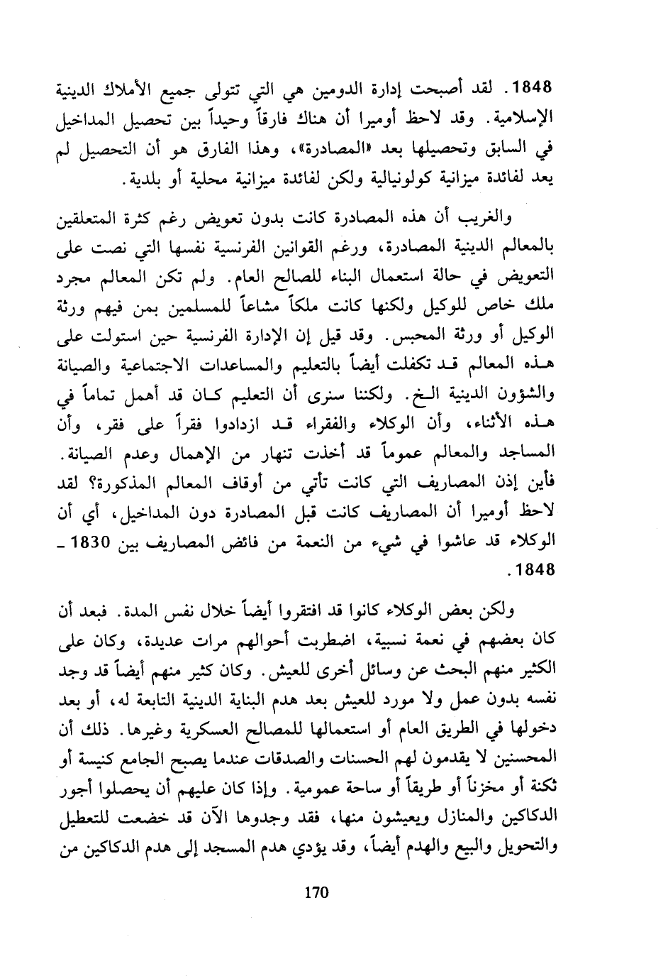 1848. لقد أصبحت إدارة الدومين هي التي تتولى جميع الأملاك الدينية الإسلامية. وقد لاحظ أوميرا أن هناك فارقا وحيدا بين تحصيل المداخيل في السابق وتحصيلها بعد (المصادرة)، وهذا الفارق هو أن التحصيل لم يعد لفائدة ميزانية كولونيالية ولكن لفائدة ميزانية محلية أو بلدية.