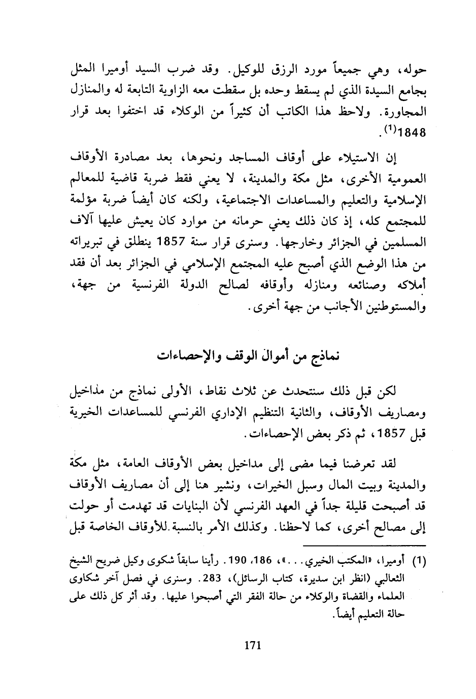 لكن قبل ذلك سنتحدث عن ثلاث نقاط، الأولى نماذج من مداخيل ومصاريف الأوقاف، والثانية التنظيم الإداري الفرنسي للمساعدات الخيرية قبل 1857، ثم ذكر بعض الإحصاءات.