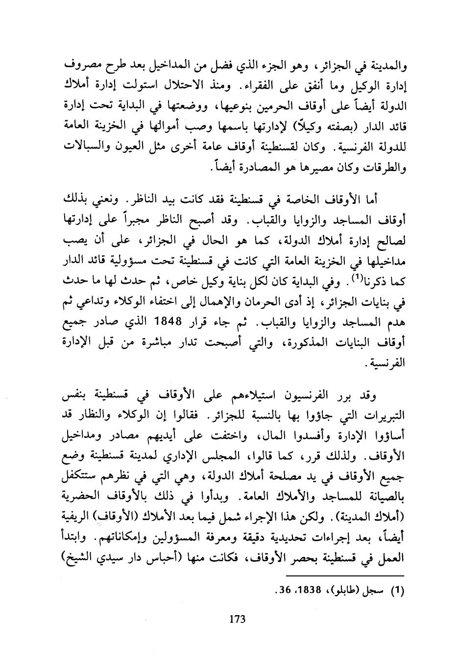 والمدينة في الجزائر، وهو الجزء الذي فضل من المداخيل بعد طرح مصروف إدارة الوكيل وما أنفق على الفقراء. ومنذ الاحتلال استولت إدارة أملاك الدولة أيضا على أوقاف الحرمين بنوعيها، ووضعتها في البداية تحت إدارة قائد الدار (بصفته وكيلا) لإدارتها باسمها وصب أموالها في الخزينة العامة للدولة الفرنسية. وكان لقسنطينة أوقاف عامة أخرى مثل العيون والسبالات والطرقات وكان مصيرها هو المصادرة أيضا.