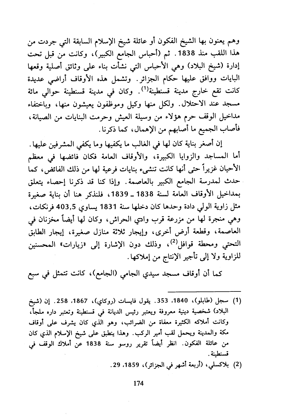 (¬1) سجل (طابلو)، 1840، 353. يقول فايسات (روكاي)، 1867، 258. إن (شيخ البلاد) شخصية دينية معروفة ويعتبر رئيس الديانة في قسنطينة وتعتبر داره ملجأ، وكانت أملاكه الكثيرة معفاة من الضرائب، وهو الذي كان يشرف على أوقاف مكة والمدينة ويحمل لقب أمير الركب. وهذا ينطبق على شيخ الإسلام الذي كان من عائلة الفكون. انظر أيضا تقرير روسو سنة 1838 عن أملاك الوقف في قسنطينة.