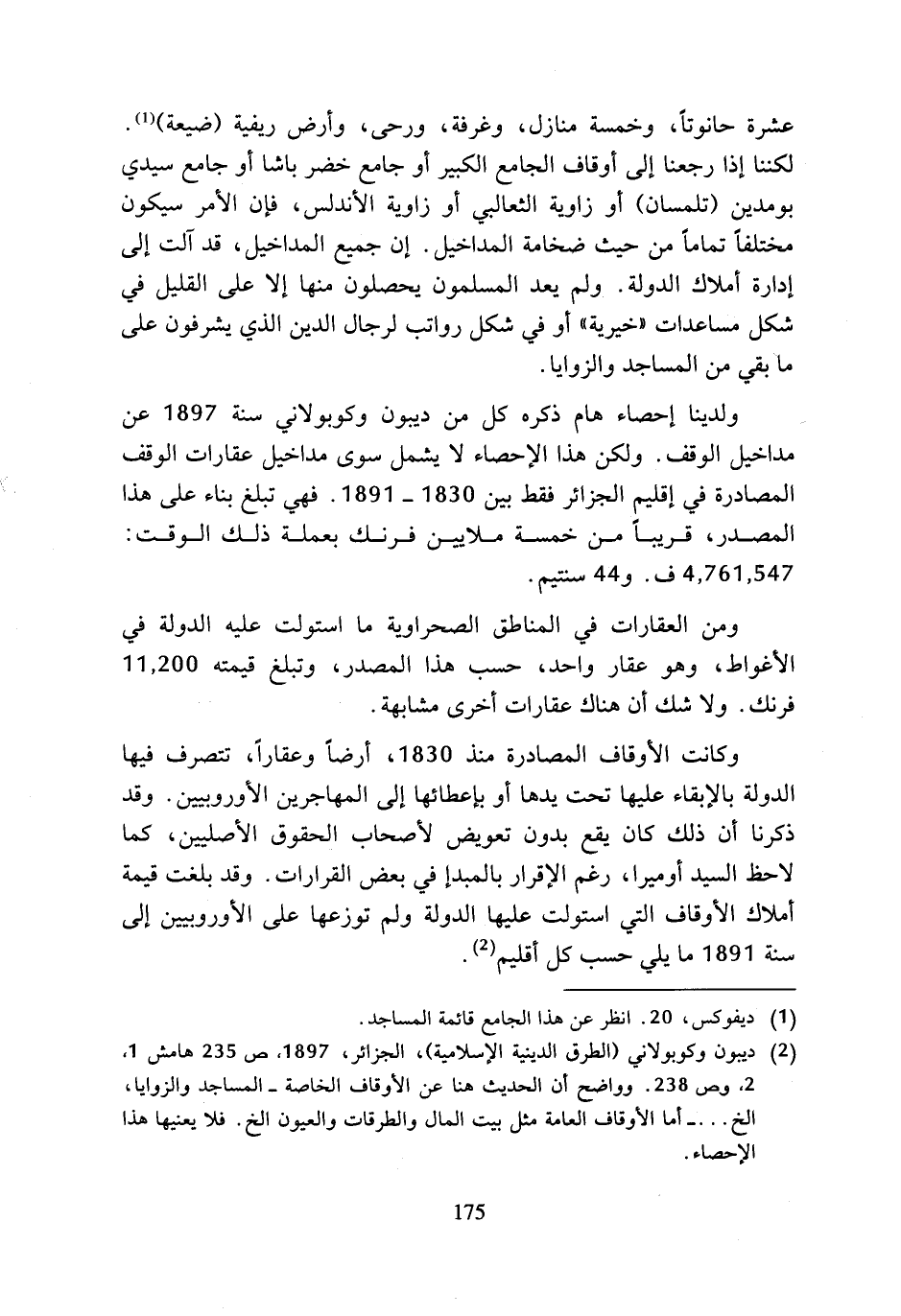 (¬2) ديبون وكوبولاني (الطرق الدينية الإسلامية)، الجزائر، 1897، ص 235 هامش 1، 2، وص 238. وواضح أن الحديث هنا عن الأوقاف الخاصة - المساجد والزوايا، الخ ... - أما الأوقاف العامة مثل بيت المال والطرقات والعيون الخ. فلا يعنيها هذا الإحصاء.
