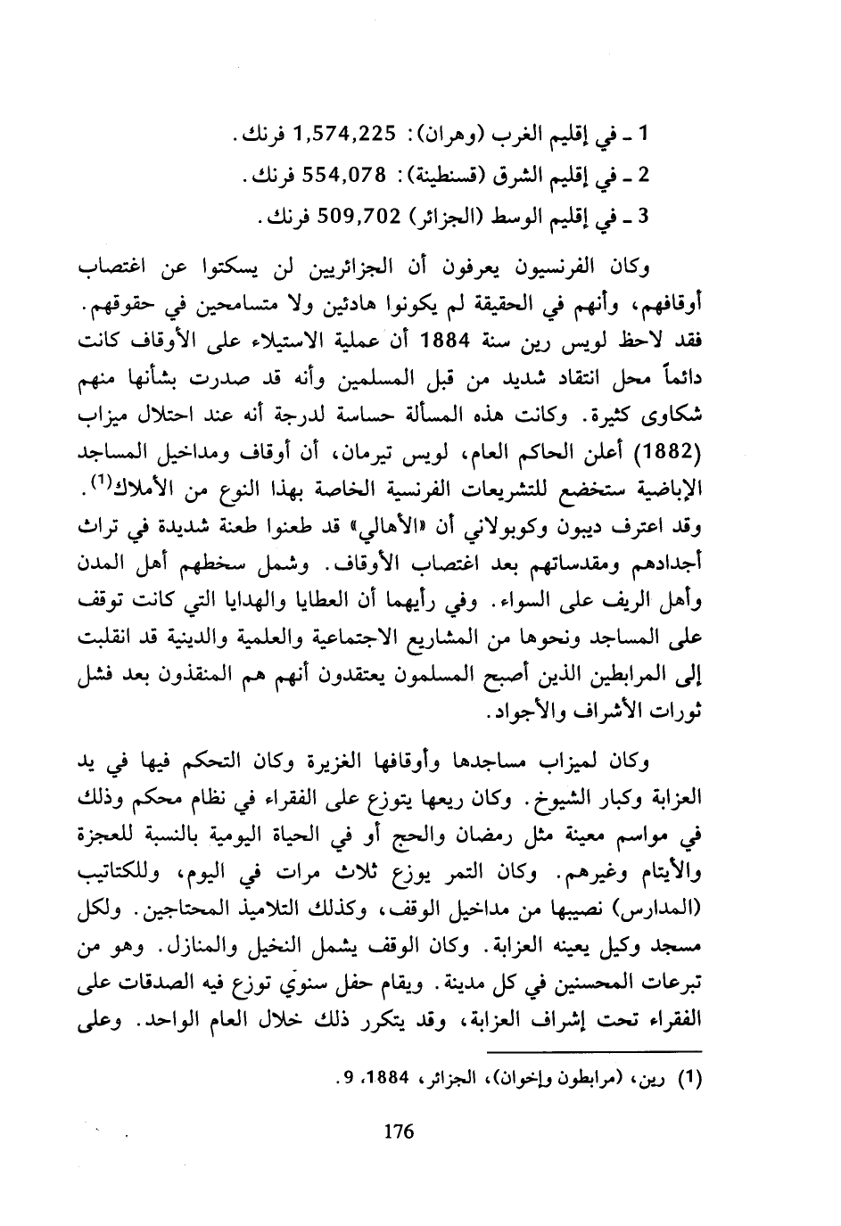 وكان الفرنسيون يعرفون أن الجزائريين لن يسكتوا عن اغتصاب أوقافهم، وأنهم في الحقيقة لم يكونوا هادئين ولا متسامحين في حقوقهم. فقد لاحظ لويس رين سنة 1884 أن عملية الاستيلاء على الأوقاف كانت دائما محل انتقاد شديد من قبل المسلمين وأنه قد صدرت بشأنها منهم شكاوى كثيرة. وكانت هذه المسألة حساسة لدرجة أنه عند احتلال ميزاب (1882) أعلن الحاكم العام، لويس تيرمان، أن أوقاف ومداخيل المساجد الإباضية ستخضع للتشريعات الفرنسية الخاصة بهذا النوع من الأملاك (¬1). وقد اعترف ديبون وكوبولاني أن (الأهالي) قد طعنوا طعنة شديدة في تراث أجدادهم ومقدساتهم بعد اغتصاب الأوقاف. وشمل سخطهم أهل المدن وأهل الريف على السواء. وفي رأيهما أن العطايا والهدايا التي كانت توقف على المساجد ونحوها من المشاريع الاجتماعية والعلمية والدينية قد انقلبت إلى المرابطين الذين أصبح المسلمون يعتقدون أنهم هم المنقذون بعد فشل ثورات الأشراف والأجواد.