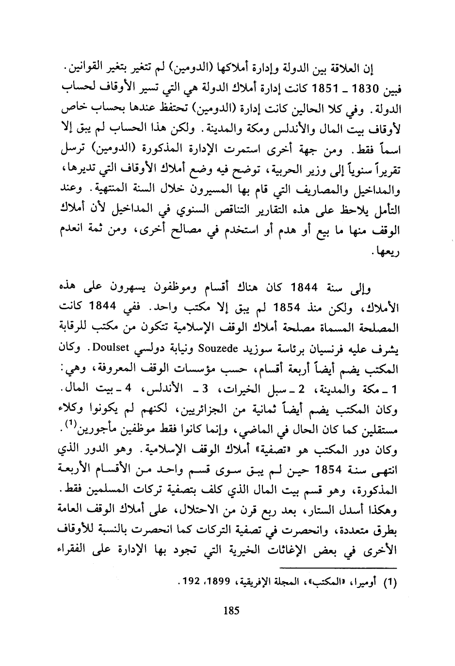 إن العلاقة بين الدولة وإدارة أملاكها (الدومين) لم تتغير بتغير القوانين. فبين 1830 - 1851 كانت إدارة أملاك الدولة هي التي تسير الأوقاف لحساب الدولة. وفي كلا الحالين كانت إدارة (الدومين) تحتفظ عندها بحساب خاص لأوقاف بيت المال والأندلس ومكة والمدينة. ولكن هذا الحساب لم يبق إلا اسما فقط. ومن جهة أخرى استمرت الإدارة المذكورة (الدومين) ترسل تقرم اسنويا إلى وزير الحربية، توضح فيه وضع أملاك الأوقاف التي تديرها، والمداخيل والمصاريف التي قام بها المسيرون خلال السنة المنتهية. وعند التأمل يلاحظ على هذه التقارير التناقص السنوي في المداخيل لأن أملاك الوقف منها ما بيع أو هدم أو استخدم في مصالح أخرى، ومن ثمة انعدم ريعها.