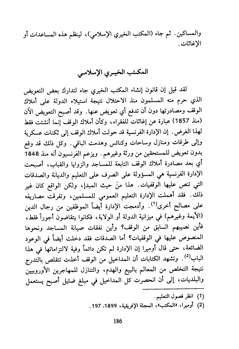 لقد قيل إن قانون إنشاء المكتب الخيري جاء لتدارك بعض التعويض الذي حرم منه المسلمون منذ الاحتلال نتيجة استيلاء الدولة على أملاك الوقف ومصادرتها دون أن تدفع أي تعويض عنها. وقد أصبح التعويض الآن (منذ 1857) عبارة عن إغاثات للفقراء، وكأن أملاك الوقف إنما أنشئت فقط لهذا الغرض. إن الإدارة الفرنسية قد حولت أملاك الوقف إلى ثكنات عسكرية وإلى طرقات ومنازل وساحات وكنائس وهدمت الباقي. وكل ذلك قد وقع بدون تعويض للمستحقين من ورثة وغيرهم. ويزعم الفرنسيون أنه منذ 1848 أي بعد مصادرة أملاك الوقف التابعة للمساجد والزوايا والقباب، أصبحت الإدارة الفرنسية هي المسؤولة على الصرف على التعليم والديانة والصدقات التي تنص عليها الوقفيات. هذا من حيث المبدإ، ولكن الواقع كان غير ذلك. فقد أهملت الإدارة التعليم العمومي للمسلمين، وتفرقت مصاريفه على مصالح أخرى (¬1). وأدمجت الإدارة أيضا الموظفين من رجال الدين (الأمة وغيرهم) في ميزانية الدولة أو الولاية، فكانوا يتقاضون أجورا فقط، فأين نصيبهم السابق من الوقف؟ وأين نفقات صيانة المساجد ونحوها المنصوص عليها في الوقفيات؟ أما الصدقات فقد دخلت أيضا في الوعود الضائعة، حتى قال أوميرا إن الإدارة لم تكن دائما وفية لالتزاماتها في هذا الباب (¬2). وتشهد الكتابات أن المداخيل من الوقف أخذت تتقلص بالتدرج نتيجة التخلص من المعالم بالبيع والهدم، والتنازل للمهاجرين الأوروبيين والبلديات، إلى أن انحصرت كل المداخيل في مبلغ ضئيل أصبح يستعمل