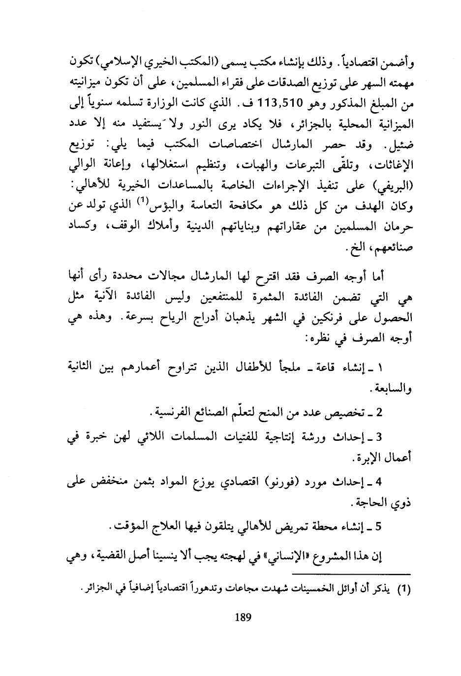 وأضمن اقتصاديا. وذلك بإنشاء مكتب يسمى (المكتب الخيري الإسلامي) تكون مهمته السهر على توزيع الصدقات على فقراء المسلمين، على أن تكون ميزانيته من المبلغ المذكور وهو 113، 510 ف. الذي كانت الوزارة تسلمه سنويا إلى الميزانية المحلية بالجزائر، فلا يكاد يرى النور ولا يستفيد منه إلا عدد ضئيل. وقد حصر المارشال اختصاصات المكتب فيما يلي: توزيع الإغاثات، وتلقى التبرعات والهبات، وتنظيم استغلالها، وإعانة الوالي (البريفي) على تنفيذ الإجراءات الخاصة بالمساعدات الخيرية للأهالي: وكان الهدف من كل ذلك هو مكافحة التعاسة والبؤس (¬1) الذي تولد عن حرمان المسلمين من عقاراتهم وبناياتهم الدينية وأملاك الوقف، وكساد صنائعهم، الخ.