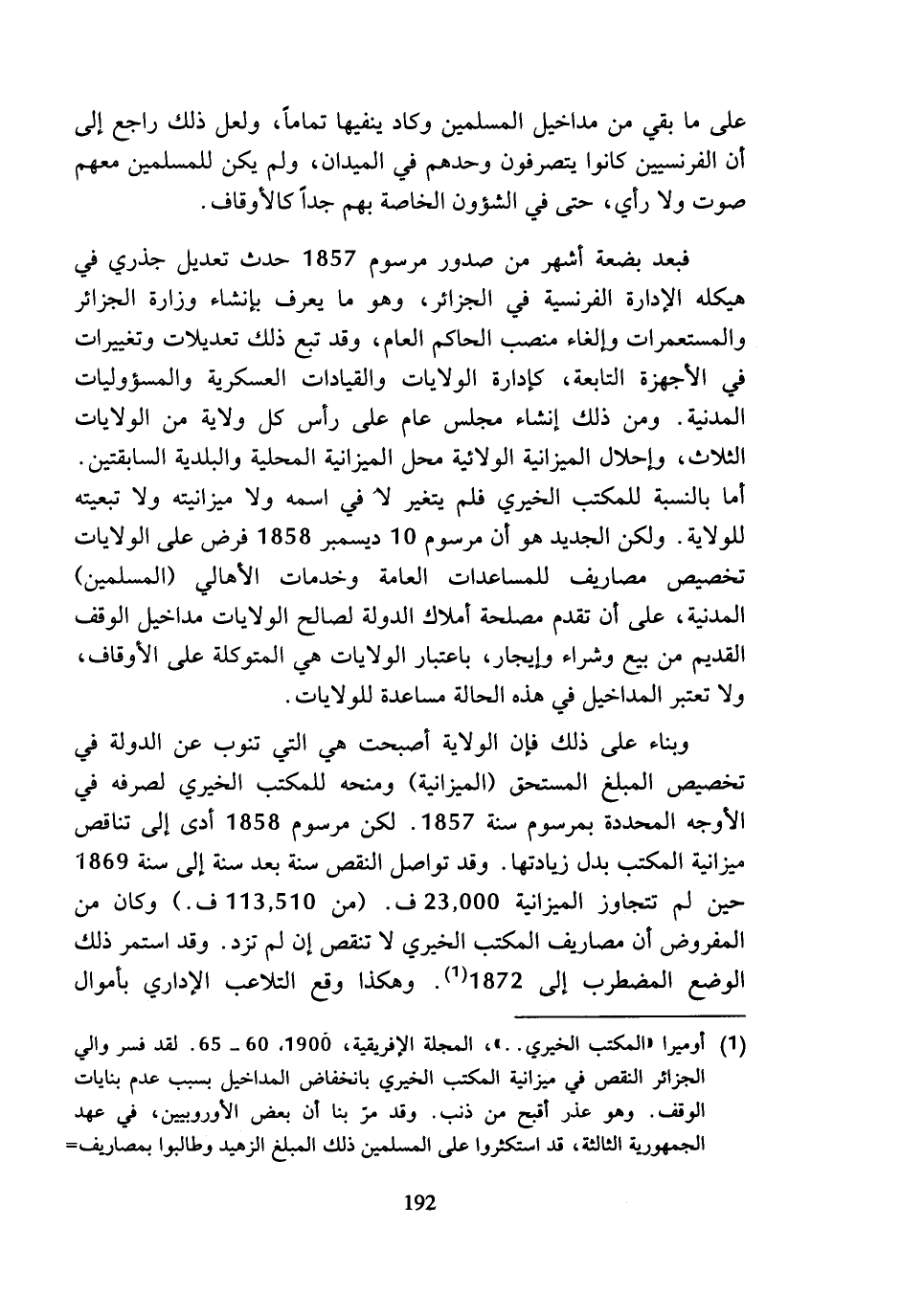 (¬1) أوميرا (المكتب الخيري ..)، المجلة الإفريقية، 1900، 60 - 65. لقد فسر والي الجزائر النقص في ميزانية المكتب الخيري بانخفاض المداخيل بسبب عدم بنايات الوقف. وهو عذر أقبح من ذنب. وقد مر بنا أن بعض الأوروبيين، في عهد الجمهورية الثالثة، قد استكثروا على المسلمين ذلك المبلغ الزهيد وطالبوا بمصاريف =