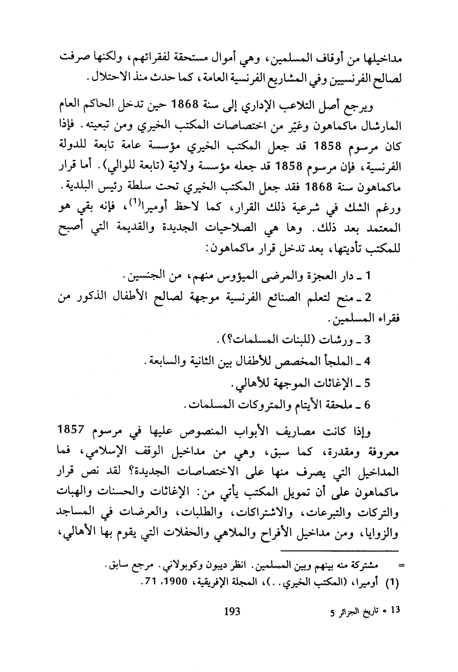 ويرجع أصل التلاعب الإداري إلى سنة 1868 حين تدخل الحاكم العام المارشال ماكماهون وغير من اختصاصات المكتب الخيري ومن تبعيته. فإذا كان مرسوم 1858 قد جعل المكتب الخيري مؤسسة عامة تابعة للدولة الفرنسية، فإن مرسوم 1858 قد جعله مؤسسة ولائية (تابعة للوالي). أما قرار ماكماهون سنة 1868 فقد جعل المكتب الخيري تحت سلطة رئيس البلدية. ورغم الشك في شرعية ذلك القرار، كما لاحظ أوميرا (¬1)، فإنه بقي هو المعتمد بعد ذلك. وها هي الصلاحيات الجديدة والقديمة التي أصبح للمكتب تأديتها، بعد تدخل قرار ماكماهون: