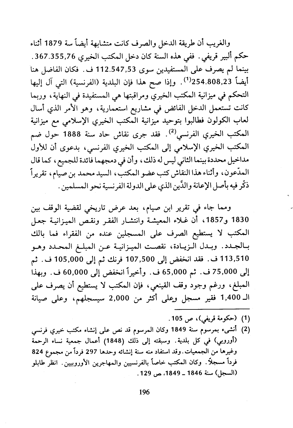 والغريب أن طريقة الدخل والصرف كانت متشابهة أيضا سنة 1879 أثناء حكم ألبير قريفي. ففي هذه السنة كان دخل المكتب الخيري 367.355,76. بينما لم يصرف على المستفيدين سوى 112، 547، 53 ف. فكان الفاضل هنا أيضا 254.808,23 (¬1). وإذا صح هذا فإن البلدية (الفرنسية) التي آل إليها التحكم في ميزانية المكتب الخيري ومراقبتها هي المستفيدة في النهاية، وربما كانت تستعمل الدخل الفائض في مشاريع استعمارية، وهو الأمر الذي أسال لعاب الكولون فطالبوا بتوحيد ميزانية المكتب الخيري الإسلامي مع ميزانية المكتب الخيري الفرنسي (¬2). فقد جرى نقاش حاد سنة 1888 حول ضم المكتب الخيري الإسلامي إلى المكتب الخيري الفرنسي، بدعوى أن للأول مداخيل محددة بينما الثاني ليس له ذلك، وأن في دمجهما فائدة للجميع، كما قال المدعون، وأثناء هذا النقاش كتب عضو المكتب، السيد محمد بن صيام، تقريرا ذكر فيه بأصل الإعانة والدين الذي على الدولة الفرنسية نحو المسلمين.
