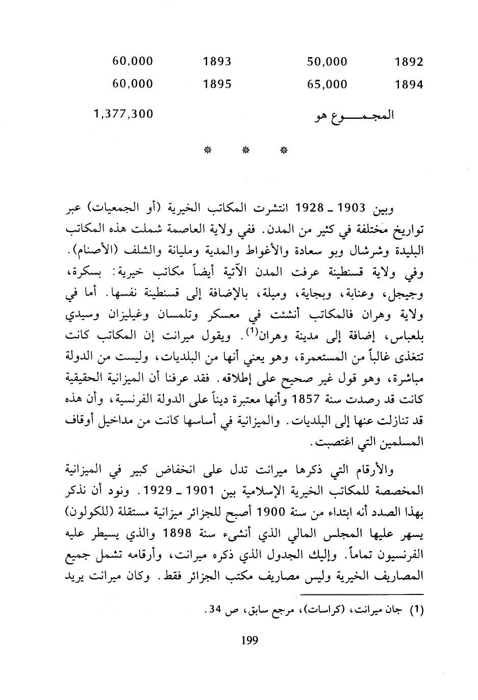 والأرقام التي ذكرها ميرانت تدل على انخفاض كبير في الميزانية المخصصة للمكاتب الخيرية الإسلامية بين 1901 - 1929. ونود أن نذكر بهذا الصدد أنه ابتداء من سنة 1900 أصبح للجزائر ميزانية مستقلة (للكولون) يسهر عليها المجلس المالي الذي أنشئ سنة 1898 والذي يسيطر عليه الفرنسيون تماما. وإليك الجدول الذي ذكره ميرانت، وأرقامه تشمل جميع المصاريف الخيرية وليس مصاريف مكتب الجزائر فقط. وكان ميرانت يريد