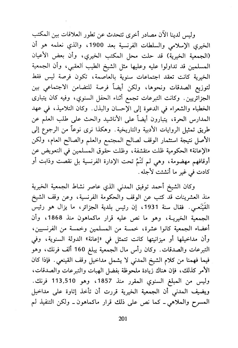 وكان الشيخ أحمد توفيق المدني الذي عاصر نشاط الجمعية الخيرية منذ العشرينات قد كتب عن الوقف والحكومة الفرنسية، وعن وقف الشيخ القينعي. فقال سنة 1931، إن رئيس بلدية الجزائر، ما يزال هو رئيس الجمعية الخيرية، وهو ما نص عليه قرار ماكماهون منذ 1868، وأن أعضاء الجمعية كانوا عشرة، خمسة من المسلمين وخمسة من الفرنسيين، وأن مداخيلها أو ميزانيتها كانت تتمثل في (إعانة) الدولة السنوية، وفي التبرعات والصدقات. وكان رأس مال الجمعية يبلغ 160 ألف فرنك، وهو فيما فهمنا من كلام الشيخ المدني لا يشمل مداخيل وقف القينعي. فإذا كان الأمر كذلك، فإن هناك زيادة ملحوظة بفضل الهبات والتبرعات والصدقات، وليس من المبلغ السنوي المقرر منذ 1857، وهو 113,510 فرنك. ويضيف المدني أن الجمعية الخيرية قررت أن تأخذ إتاوة على مداخيل المسرح والملاهي - كما نص على ذلك قرار ماكماهون - ولكن التنفيذ لم