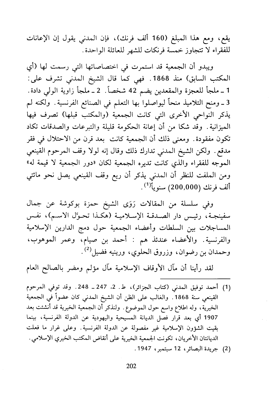 (¬1) أحمد توفيق المدني (كتاب الجزائر)، ط. 2، 7 24 - 248. وقد توفي المرحوم القينعي سنة 1868. والغالب على الظن أن الشيخ المدني كان عضوا في الجمعية الخيرية، وله اطلاع واسع حول الموضوع. ولنذكر أن الجمعية الخيرة قد أنشئت بعد 1907 أي بعد قرار فصل الديانة المسيحية واليهودية عن الدولة الفرنسية، بينما بقيت الشؤون الإسلامية غير مفصولة عن الدولة الفرنسية. وعلى غرار ما فعلت الديانتان الأخريان، تكونت الجمعية الخيرية على أنقاض الكتب الخيري الإسلامي.