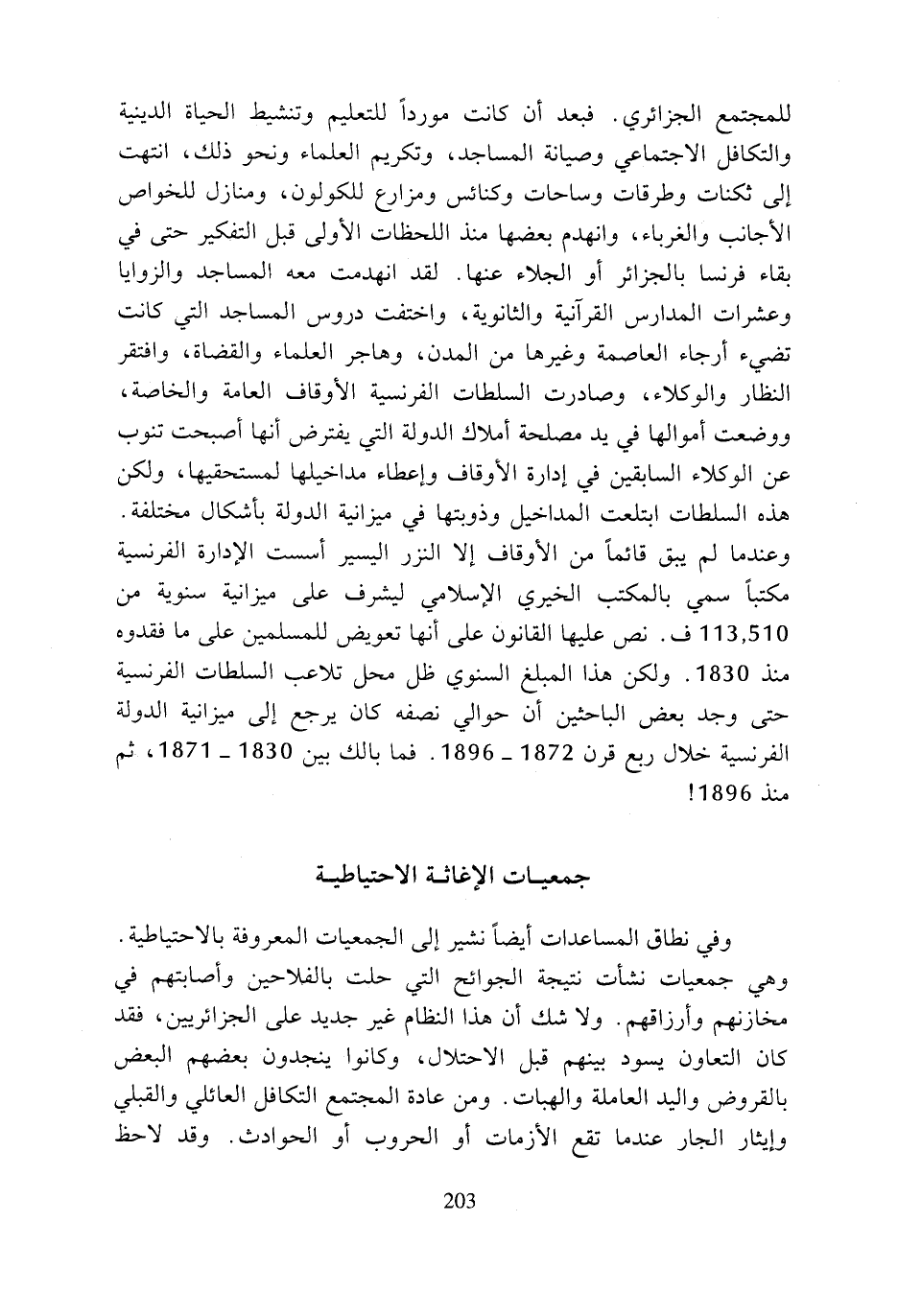 للمجتمع الجزائري. فبعد أن كانت موردا للتعليم وتنشيط الحياة الدينية والتكافل الاجتماعي وصيانة المساجد، وتكريم العلماء ونحو ذلك، انتهت إلى ثكنات وطرقات وساحات وكنائس ومزارع للكولون، ومنازل للخواص الأجانب والغرباء، وانهدم بعضها منذ اللحظات الأولى قبل التفكير حتى في بقاء فرنسا بالجزائر أو الجلاء عنها. لقد انهدمت معه المساجد والزوايا وعشرات المدارس القرآنية والثانوية، واختفت دروس المساجد التي كانت تضيء أرجاء العاصمة وغيرها من المدن، وهاجر العلماء والقضاة، وافتقر النظار والوكلاء، وصادرت السلطات الفرنسية الأوقاف العامة والخاصة، ووضعت أموالها في يد مصلحة أملاك الدولة التي يفترض أنها أصبحت تنوب عن الوكلاء السابقين في إدارة الأوقاف وإعطاء مداخيلها لمستحقيها، ولكن هذه السلطات ابتلعت المداخيل وذوبتها في ميزانية الدولة بأشكال مختلفة. وعندما لم يبق قائما، من الأوقاف إلا النزر اليسير أسست الإدارة الفرنسية مكتبا سمي بالمكتب الخيري الإسلامي ليشرف على ميزانية سنوية من 113، 510 ف. نص عليها القانون على أنها تعويض للمسلمين على ما فقدوه منذ 1830. ولكن هذا المبلغ السنوي ظل محل تلاعب السلطات الفرنسية حتى وجد بعض الباحثين أن حواليه كان يرجع إلى ميزانية الدولة الفرنسية خلال ربع قرن 1872 - 1896. فما بالك بين 1830 - 1871، ثم منذ 1896!