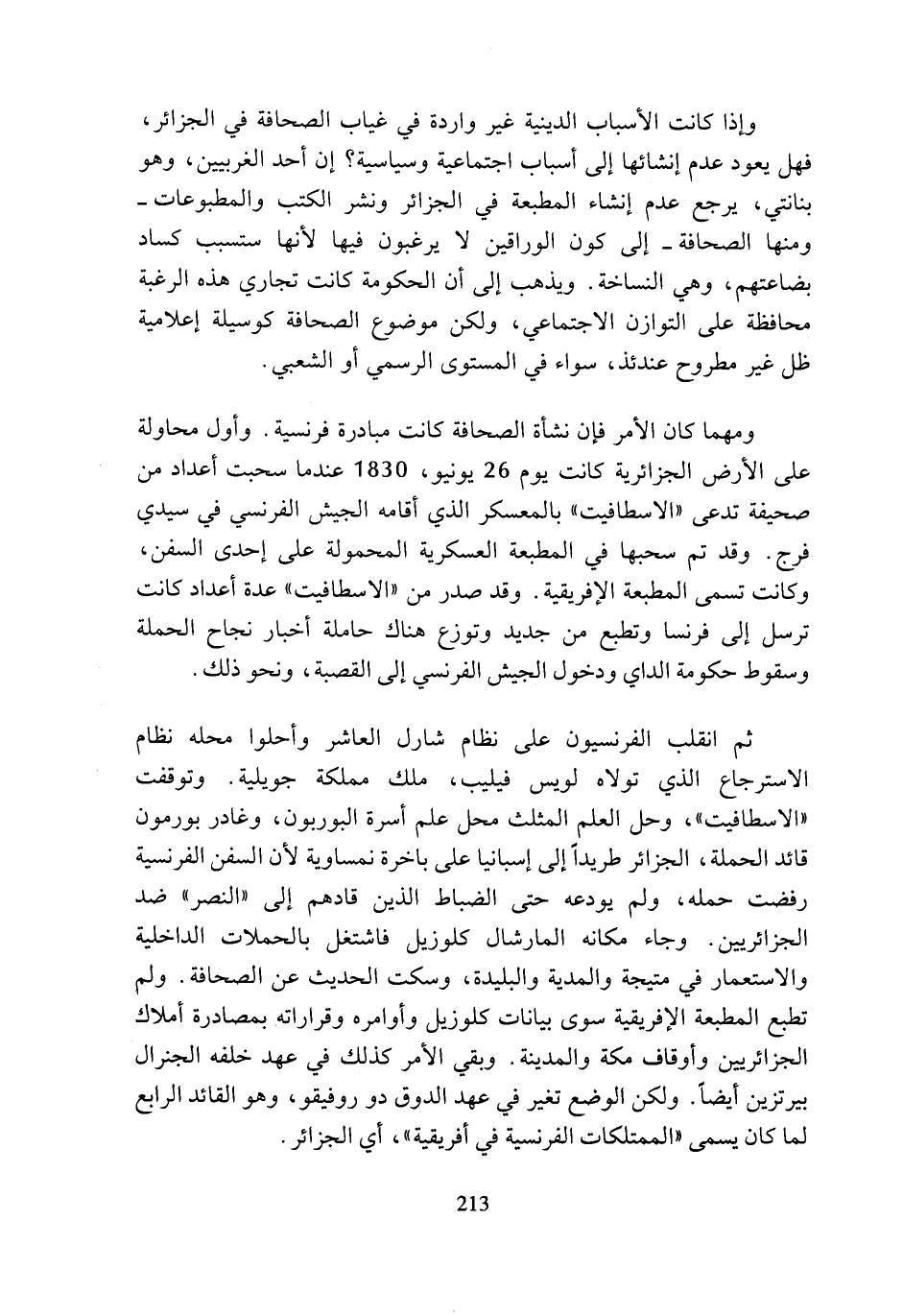 ثم انقلب الفرنسيون على نظام شارل العاشر وأحلوا محله نظام الاسترجاع الذي تولاه لويس فيليب، ملك مملكة جويلية. وتوقفت (الاسطافيت)، وحل العلم المثلث محل علم أسرة البوربون، وغادر بورمون قائد الحملة، الجزائر طريدا إلى إسبانيا على باخرة نمساوية لأن السفن الفرنسية رفضت حمله، ولم يودعه حتى الضباط الذين قادهم إلى (النصر) ضد الجزائريين. وجاء مكانه المارشال كلوزيل فاشتغل بالحملات الداخلية والاستعمار في متيجة والمدية والبليدة، وسكت الحديث عن الصحافة. ولم تطبع المطبعة الإفريقية سوى بيانات كلوزيل وأوامره وقراراته بمصادرة أملاك الجزائريين وأوقاف مكة والمدينة. وبقي الأمر كذلك في عهد خلفه الجنرال بيرتزين أيضا. ولكن الوضع تغير في عهد الدوق دوروفيقو، وهو القائد الرابع لما كان يسمى (الممتلكات الفرنسية في أفريقية)، أي الجزائر.