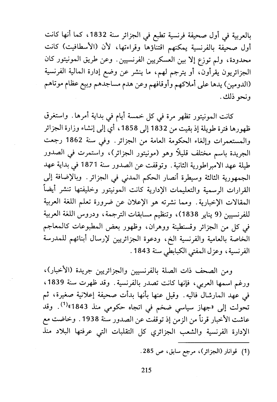 بالعربية في أول صحيفة فرنسية تطبع في الجزائر سنة 1832، كما أنها كانت أول صحيفة بالفرنسية يمكنهم اقتناؤها وقراءتها، لأن (الأسطافيت) كانت محدودة، ولم توزع إلا بين العسكريين الفرنسيين. وعن طريق المونيتور كان الجزائريون يقرأون، أو يترجم لهم، ما ينشر عن وضع إدارة المالية الفرنسية (الدومين) يدها على أملاكهم وأوقافهم وعن هدم مساجدهم وبيع عظام موتاهم ونحو ذلك.