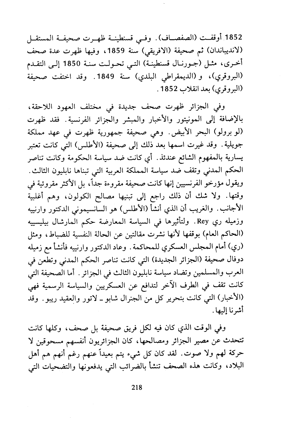 1852 أوقفت (الصفصاف). وفي قسنطينة ظهرت صحيفة المستقل (لانديباندان) ثم صحيفة (الافريقي) سنة 1859، وفيها ظهرت عدة صحف أخرى، مثل (جورنال قسنطينة) التي تحولت سنة 1850 إلى التقدم (البروقري)، و (الديمقراطي البلدي) سنة 1849. وقد اختفت صحيفة (البروقري) بعد انقلاب 1852.