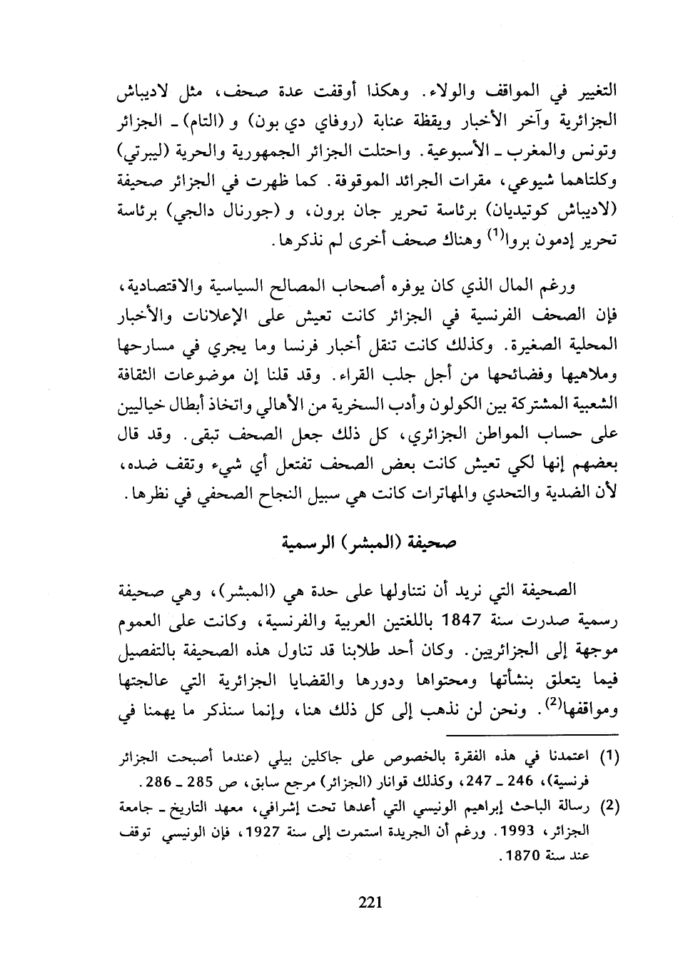 (¬2) رسالة الباحث إبراهيم الونيسي التي أعدها تحت إشرافي، معهد التاريخ - جامعة الجزائر، 1993. ورغم أن الجريدة استمرت إلى سنة 1927، فإن الونيسي توقف عند سنة 1870.