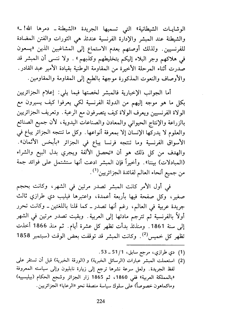الوشايات الشيطانية) التي تسميها الجريدة (الشيطنة- دمرها الله! -) والشيطنة عند المبشر والإدارة الفرنسية عندئذ هي الثورات والفتن المضادة للفرنسيين. ولذلك أوصتهم بعدم الاستماع إلى المشاغبين الذين (يسعون في هلاكهم وجر البلاء إليكم بتخليطهم وكذبهم). ولا ننسى أن المبشر قد صدرت أثناء المرحلة الأخيرة من المقاومة الوطنية بقيادة الأمير عبد القادر. والأوصاف والنعوت المذكورة موجهة بالطبع إلى المقاومة والمقاومين.