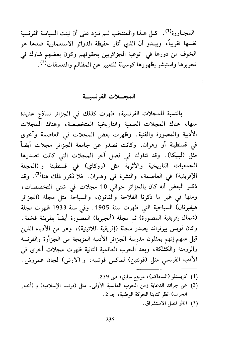 بالنسبة للمجلات الفرنسية، ظهرت كذلك في الجزائر نماذج عديدة منها، هناك المجلات العلمية والتاريخية المتخصصة، وهناك المجلات الأدبية والمصورة والفنية. وظهرت بعض المجلات في العاصمة وأخرى في قسنطينة أو وهران. وكانت تصدر عن جامعة الجزائر مجلات أيضا مثل (ليبيكا). وقد تناولنا في فصل آخر المجلات التي كانت تصدرها الجمعيات التاريخية والأثرية مثل (روكاي) في قسنطينة و (المجلة الإفريقية) في العاصمة، والنشرة في وهران. فلا نكرر ذلك هنا (¬3). وقد ذكر البعض أنه كان بالجزائر حوالي 10 مجلات في شتى التخصصات، ومنها في غير ما ذكرنا الفلاحة والقانون، والسياحة مثل مجلة (الجزائر هيفيرنال) السياحية التي ظهرت سنة 1905. وفي سنة 1933 ظهرت مجلة (شمال إفريقية المصورة) ثم مجلة (ألجيريا) المصورة أيضا بطريقة فخمة. وكان لويس بيرتراند يصدر مجلة (إفريقية اللاتينية)، وهو من الأدباء الذين قيل عنهم إنهم يمثلون مدرسة الجزائر الأدبية المزيجة من الجزأرة والفرنسة والرومنة والكثلكة، وبعد الحرب العالمية الثانية ظهرت مجلات أخرى في الأدب الفرنسي مثل (فونتين) لماكس فوشيه، و (لارش) لجان عمروش.