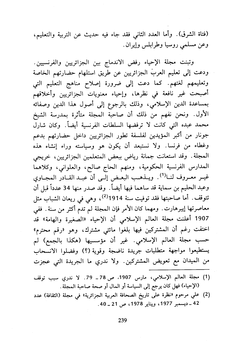 وتبنت مجلة الإحياء رفض الاندماج بين الجزائريين والفرنسيين. ودعت إلى تعليم العرب الجزائريين عن طريق استلهام حضارتهم الخاصة وتعليمهم لغتهم. كما دعت إلى ضرورة إصلاح مناهج التعليم التي أصبحت غير نافعة في نظرها، وإحياء معنويات الجزائريين وأخلاقهم بمساعدة الدين الإسلامي، وذلك بالرجوع إلى أصول هذا الدين وصفائه الأول. ونحن نفهم من ذلك أن صاحبة المجلة متأثرة بمدرسة الشيخ محمد عبده التي كانت لا ترفضها السلطات الفرنسية أيضا. وكان شارل جونار من أكبر المؤيدين لفلسفة تطور الجزائريين داخل حضارتهم بدعم وغطاء من فرنسا. ولا نستبعد أن يكون هو وسياسته وراء إنشاء هذه المجلة. وقد استعانت جمانة رياض ببعض المتعلمين الجزائريين، خريجي المدارس الفرنسية الحكومية، ومنهم الحاج صالح، والعلواني، وكلاهما غير معروف لنا (¬1). ويذهب البعض إلى أن عبد القادر المجاوي وعبد الحليم بن سماية قد ساهما فيها أيضا .. وقد صدر منها 34 عددا قبل أن تتوقف. أما صاحبتها فقد توفيت سنة 1914 (¬2)، وهي في ريعان الشباب مثل معاصرتها إيبرهارت. ومهما كان الأمر فإن المجلة لم تدم أكثر من سنة. ففي 1907 أعلنت مجلة العالم الإسلامي أن الإحياء (الصغيرة والهامة) قد اختفت رغم أن المشتركين فيها بلغوا مائتي مشترك، وهو (رقم محترم) حسب مجلة العالم الإسلامي. غير أن مؤسسيها (هكذا بالجمع) لم يستطيعوا مواجهة متطلبات جريدة ناضجة وقوية (؟) وفضلوا الانسحاب من الميدان مع تعويض المشتركين. ولا ندري ما الجريدة التي عجزت