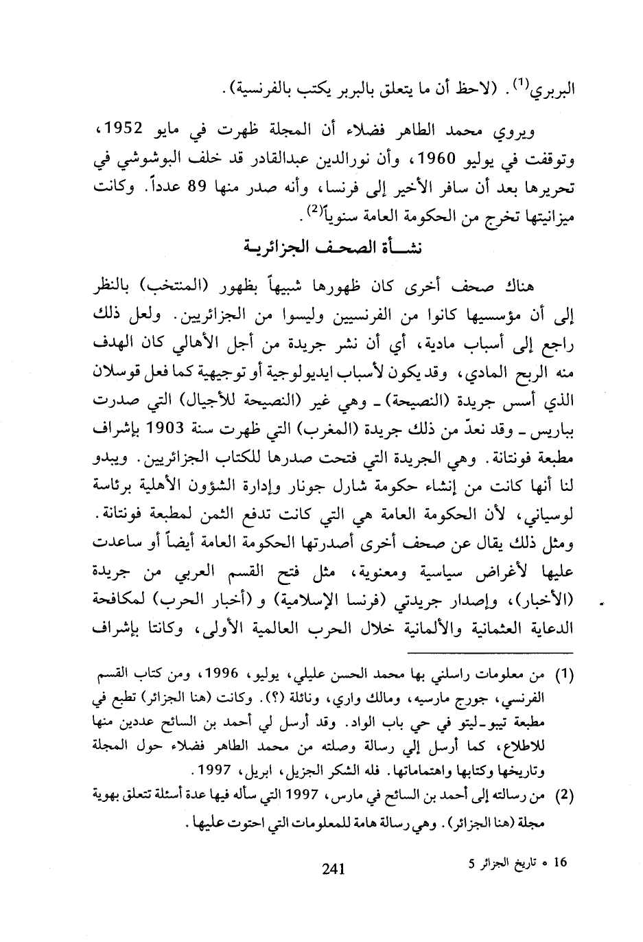 (¬1) من معلومات راسلني بها محمد الحسن عليلي، يوليو، 1996، ومن كتاب القسم الفرنسي، جورج مارسيه، ومالك واري، ونائلة (؟). وكانت (هنا الجزائر) تطبع في مطبعة تيبو - ليتو في حي باب الواد. وقد أرسل لي أحمد بن السائح عددين منها للاطلاع، كما أرسل إلي رسالة وصلته من محمد الطاهر فضلاء حول المجلة وتاريخها وكتابها واهتماماتها. فله الشكر الجزيل، ابريل، 1997.
