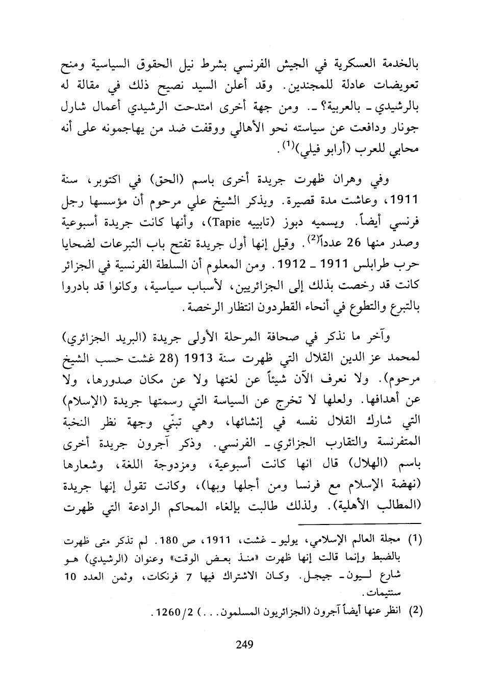 (¬1) مجلة العالم الإسلامي، يوليو - غشت، 1911، ص 180. لم تذكر متى ظهرت بالضبط وإنما قالت إنها ظهرت (منذ بعض الوقت) وعنوان (الرشيدي) هو شارع لبون - جيجل. وكان الاشتراك فيها 7 فرنكات، وثمن العدد 10 سنتيمات.