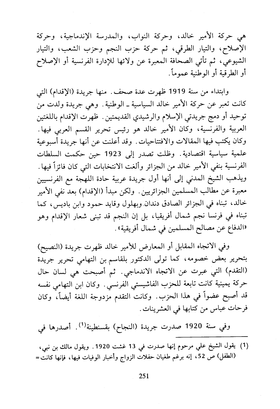 وفي الاتجاه المقابل أو المعارض للأمير خالد ظهرت جريدة (النصيح) بتحرير بعض خصومه، كما تولى الدكتور بلقاسم بن التهامي تحرير جريدة (التقدم) التي عبرت عن الاتجاه الاندماجي. ثم أصبحت هي لسان حال حركة يمينية كانت تابعة للحزب الفاشيستي الفرنسي. وكان ابن التهامي نفسه قد أصبح عضوا في هذا الحزب. وكانت التقدم مزدوجة اللغة أيضا، وكان فرحات عباس من كتابها في العشرينات.