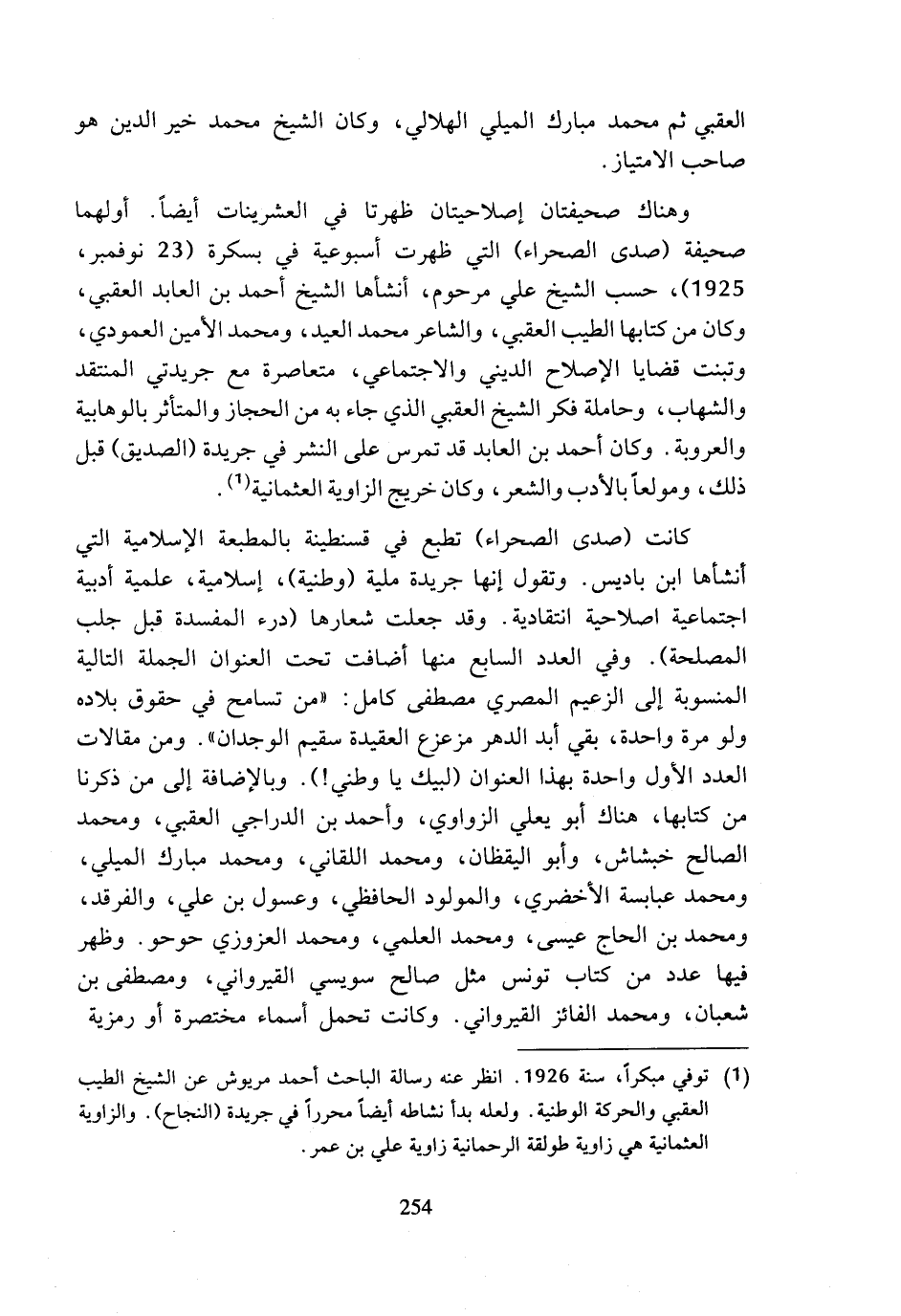 (¬1) توفي مبكرا، سنة 1926. انظر عنه رسالة الباحث أحمد مريوش عن الشيخ الطيب العقبي والحركة الوطنية. ولعله بدأ نشاطه أيضا محررا في جريدة (النجاح). والزاوية العثمانية هي زاوية طولقة الرحمانية زاوية علي بن عمر.